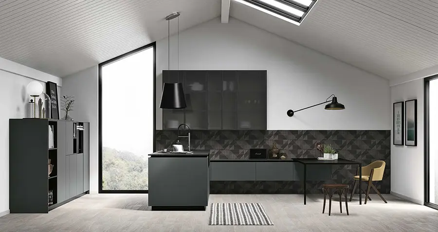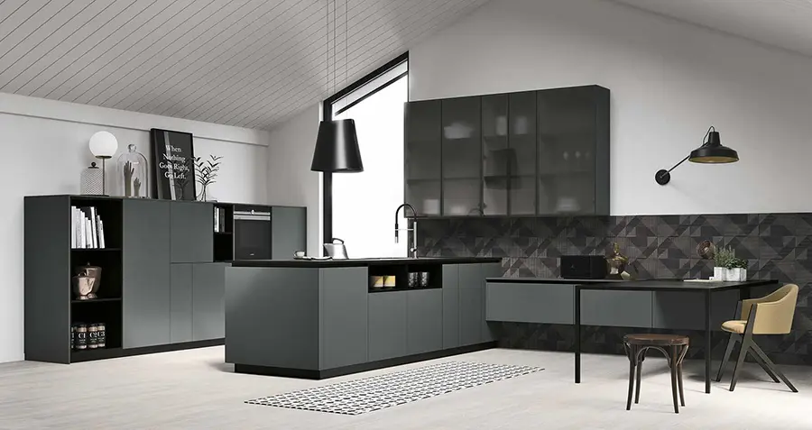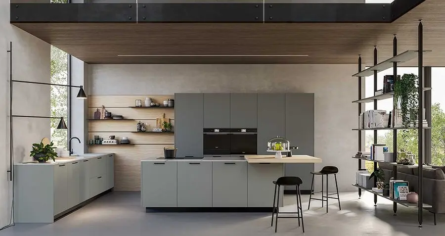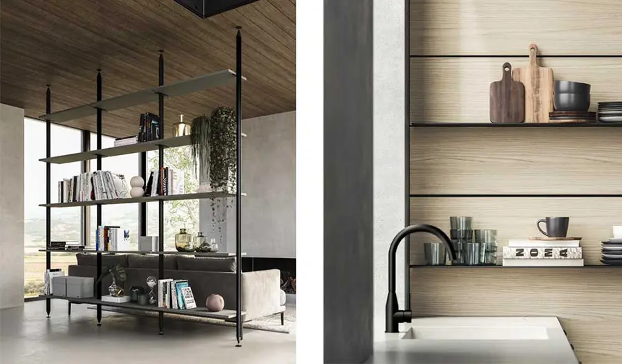 La estantería de suelo a techo, también disponible para pared, tiene una estructura modular de aluminio anodizado negro con baldas elegidas de melamina monocolor Nebbia, el mismo acabado de los muebles bajos. La estructura modular de la boiserie, que une los muebles bajos situados bajo la ventana con las columnas, es de Synchroface olmo Paglia y está equipada con estantes de aluminio Black. La zona de cocinado está concentrada en la isla, que acoge la placa de inducción, y las columnas traseras, con el horno y el microondas, para facilitar el flujo de trabajo. Esta cocina puede adaptarse en cuanto a medidas y acabados. Según las necesidades de cada cliente. Consúlta con nuestro equipo de profesionales para más información.