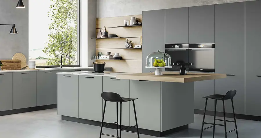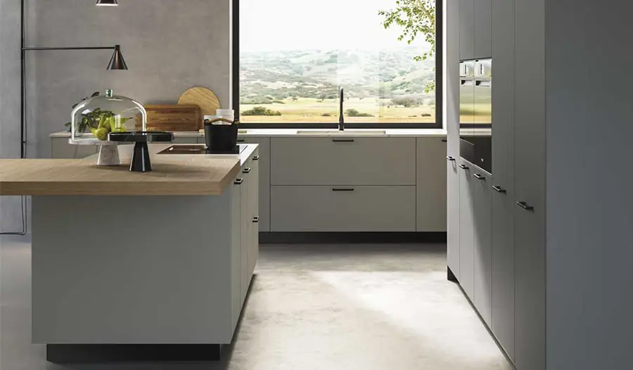 COCINA CON ISLA GRIS Y CUARZO