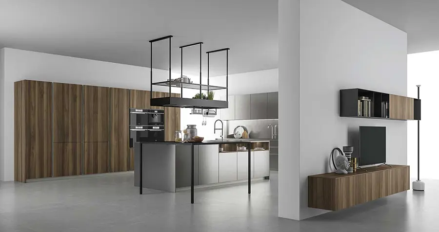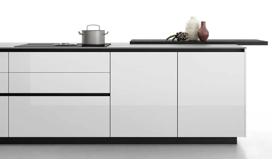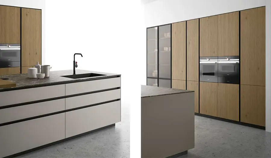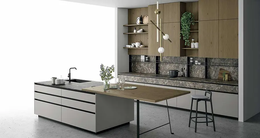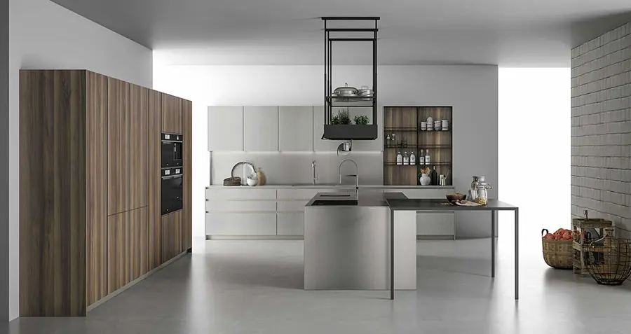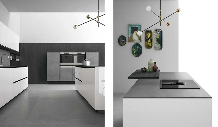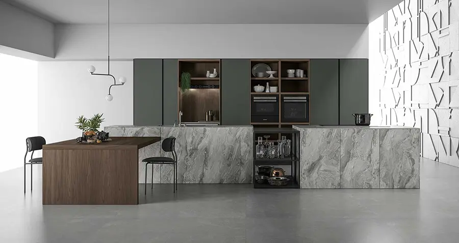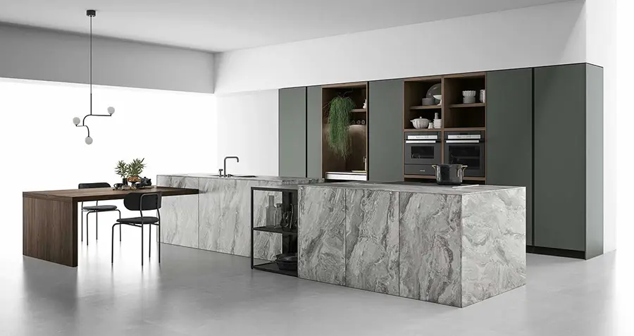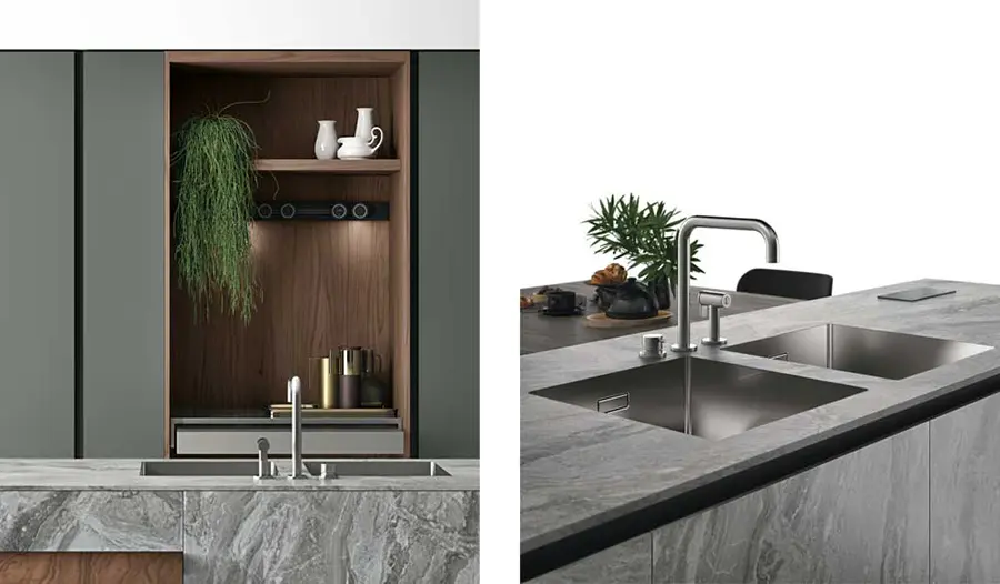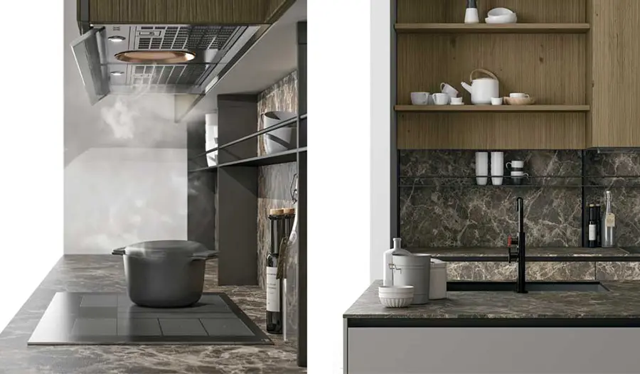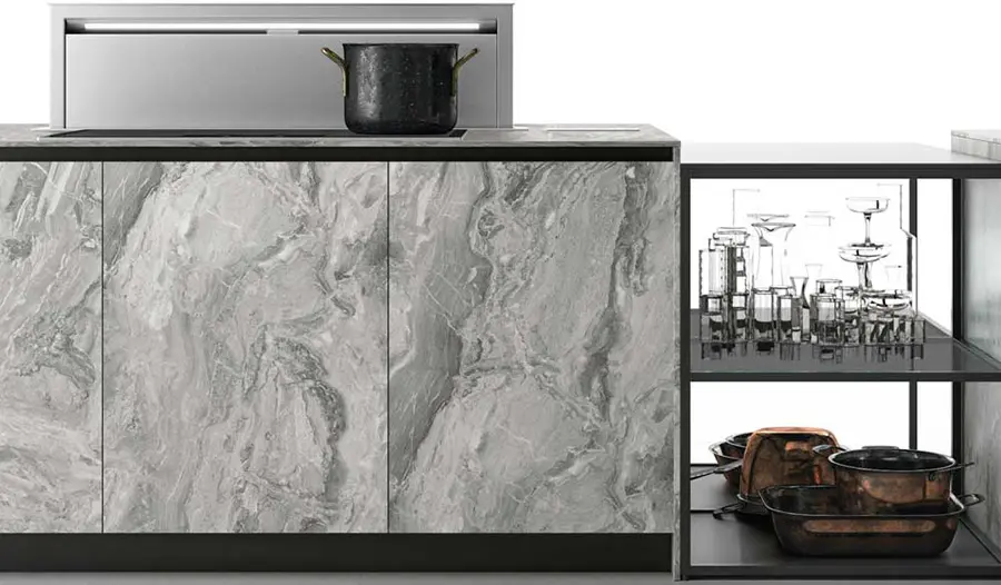 Tanto la encimera de la cocina de gres Pietra di Savoia Grigia, como las puertas de vidrio son impermeables y resistentes a los arañazos y las abrasiones. Las puertas pueden fabricarse en acabado al ácido o brillante.