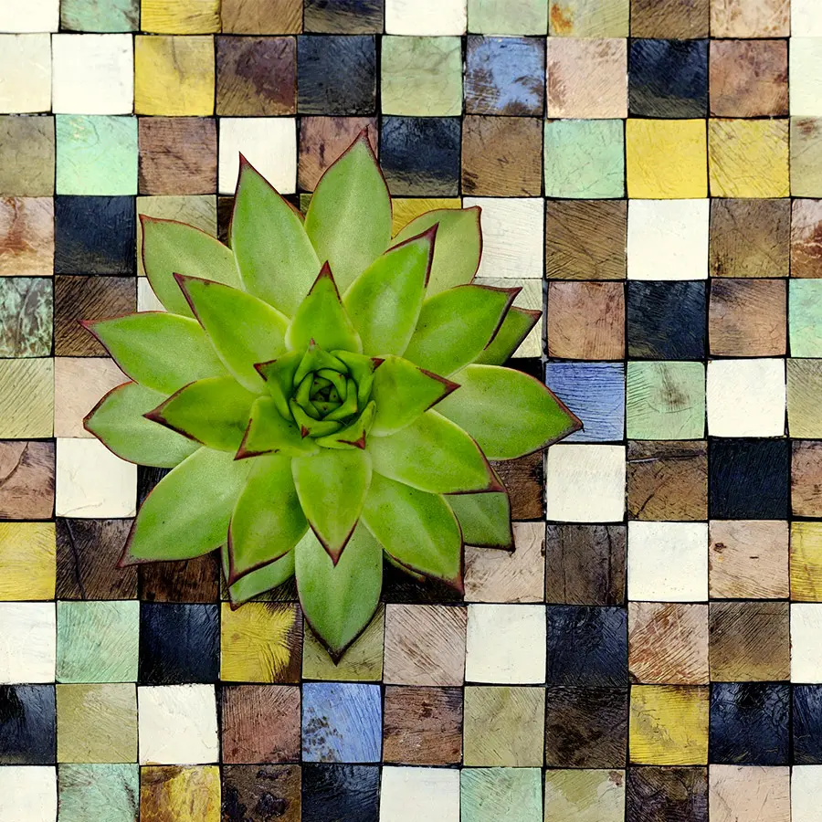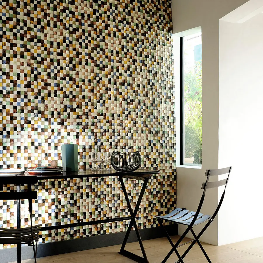 Bajo su corona de hojas, las palmeras de la costa, los cocoteros, dejan caer sus frutos en la arena. Y el coco se vuelve concha. Falso liso o motivos que se ensamblan sin parecerse, naturales y preciosos enclaves de un arte venido de horizontes lejanos. «Coco shells» es el resultado de una destreza artesanal única y minuciosa. Los ensamblajes de diseños son infinitos.
