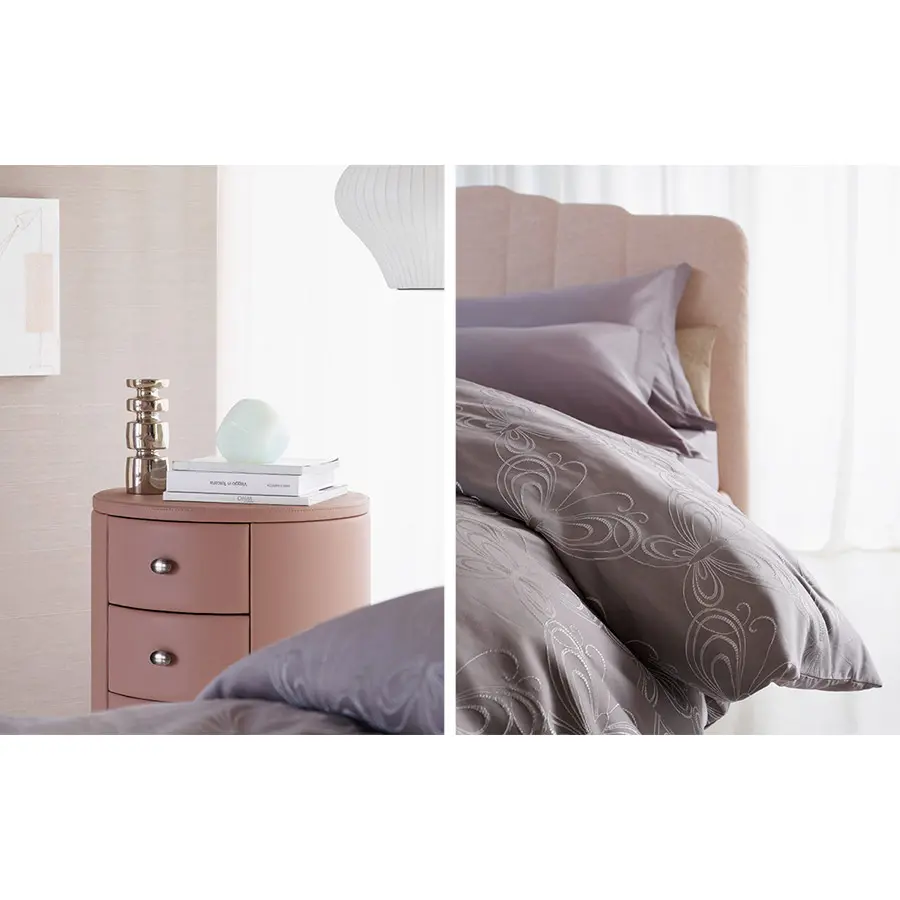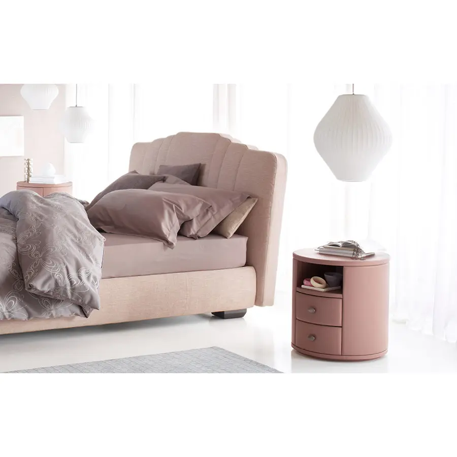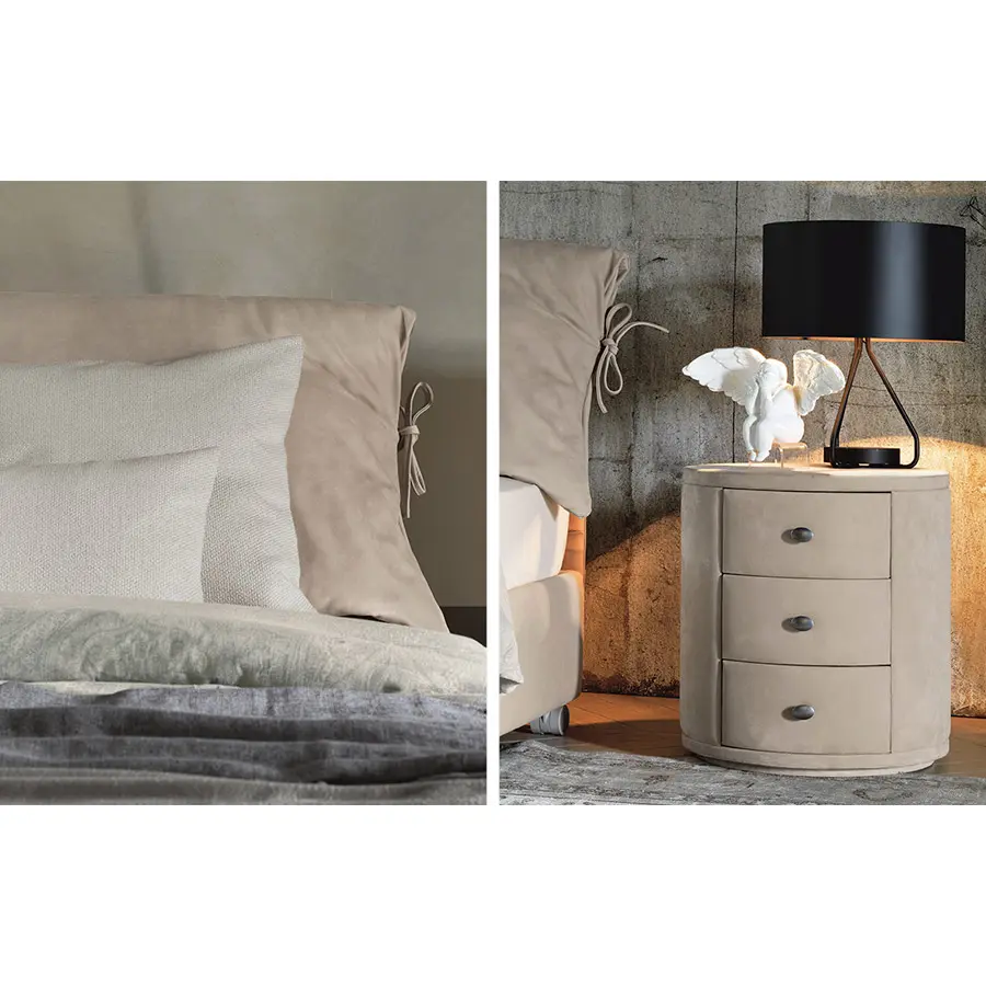 Mesita de noche redonda con dos o tres cajones de extracción total y sistema de cierre amortiguado. Estructura tapizada en piel. Tiradores con acabado bruñido cepillado.