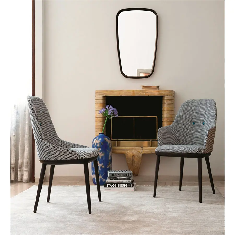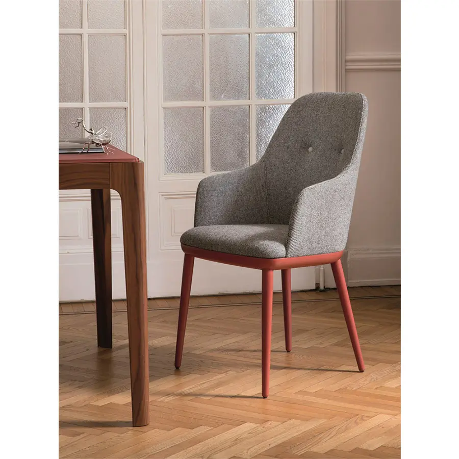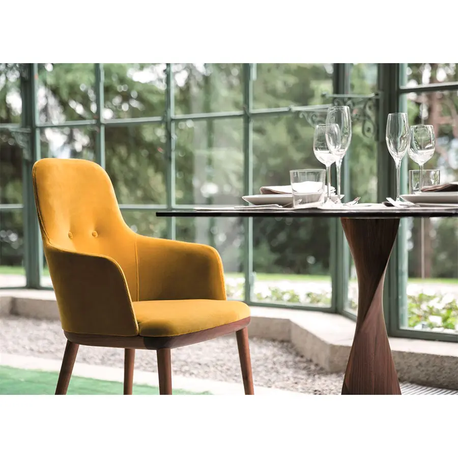 Silla con estructura en fresno macizo y revestimiento en las telas de la colección. Puede ser con o sin reposabrazos. Respaldo y botones en la misma tela del asiento o en contraste. Con sus generosas dimensiones, Andy es una silla perfecta para lo más sofisticados comedores.
