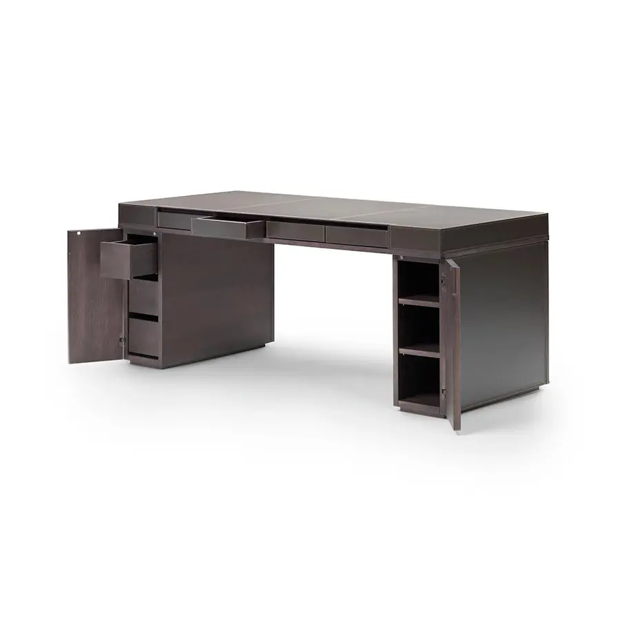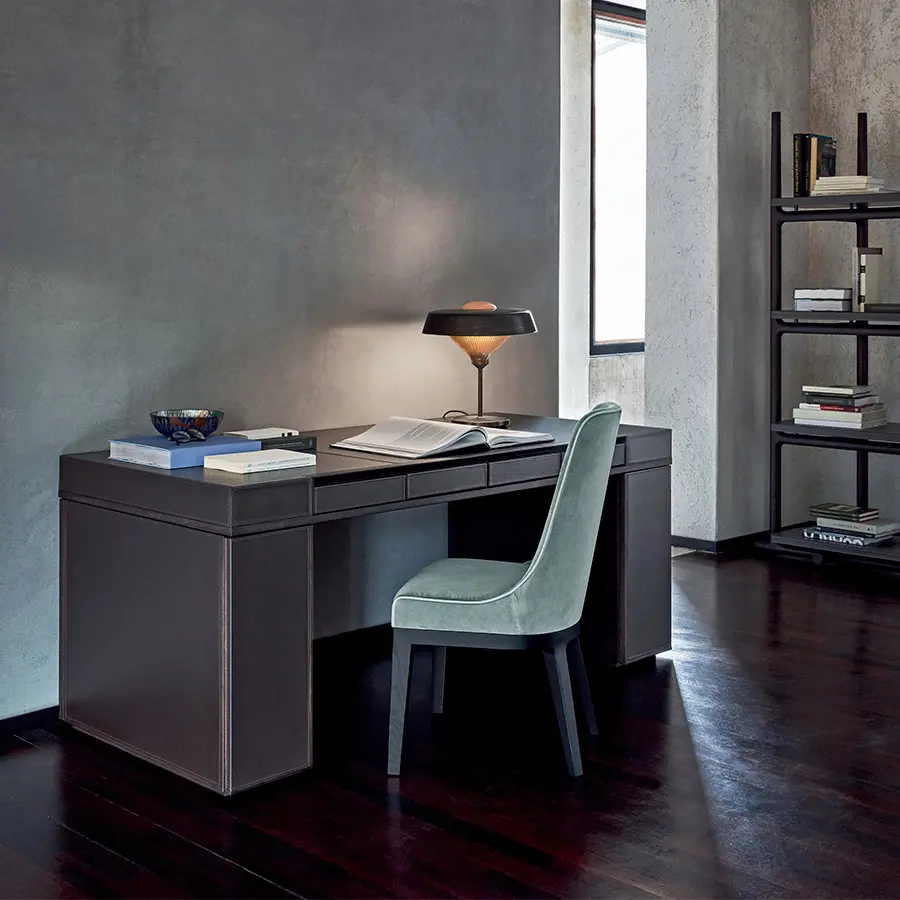 Conway es un precioso escritorio caracterizado por una estructura de madera maciza de fresno barnizada en varias tonalidades, totalmente recubierto de cuero. Las sofisticadas costuras a la vista recuerdan la tradición de la guarnicionería y revela el gusto por el detalle refinado que siempre ha formado parte del savoir-faire de la empresa. El escritorio Conway está equipado con prácticos cajones de madera maciza con frentes revestidos de cuero. Conway es un accesorio importante, para conocedores capaces de apreciar plenamente los refinados detalles constructivos, y puede encontrar una ubicación digna en diferentes estancias de la casa: desde el estudio, hasta el dormitorio o en un rincón de la sala de estar.
