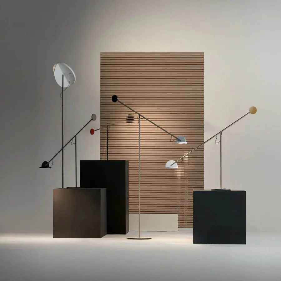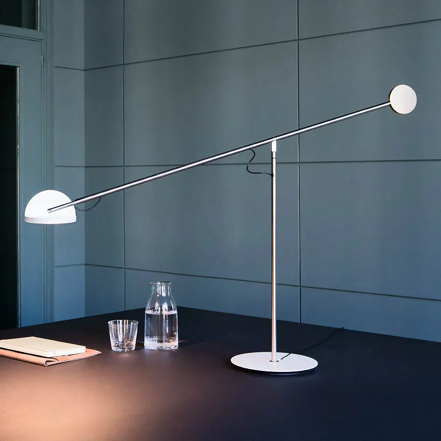 La colección se compone de una versión de escritorio y otra de pie que juegan con contrapesos al mezclar materiales de distinta densidad, como aluminio en el cabezal o acero en el extremo opuesto. Esta estructura permite mover la lámpara con gran precisión alcanzando alturas y distancias distintas para ajustar la posición y la dirección del haz de luz.
