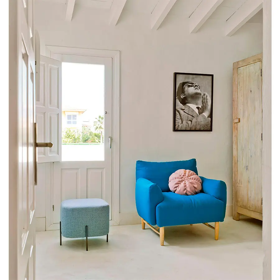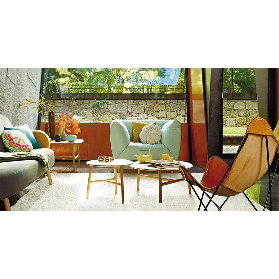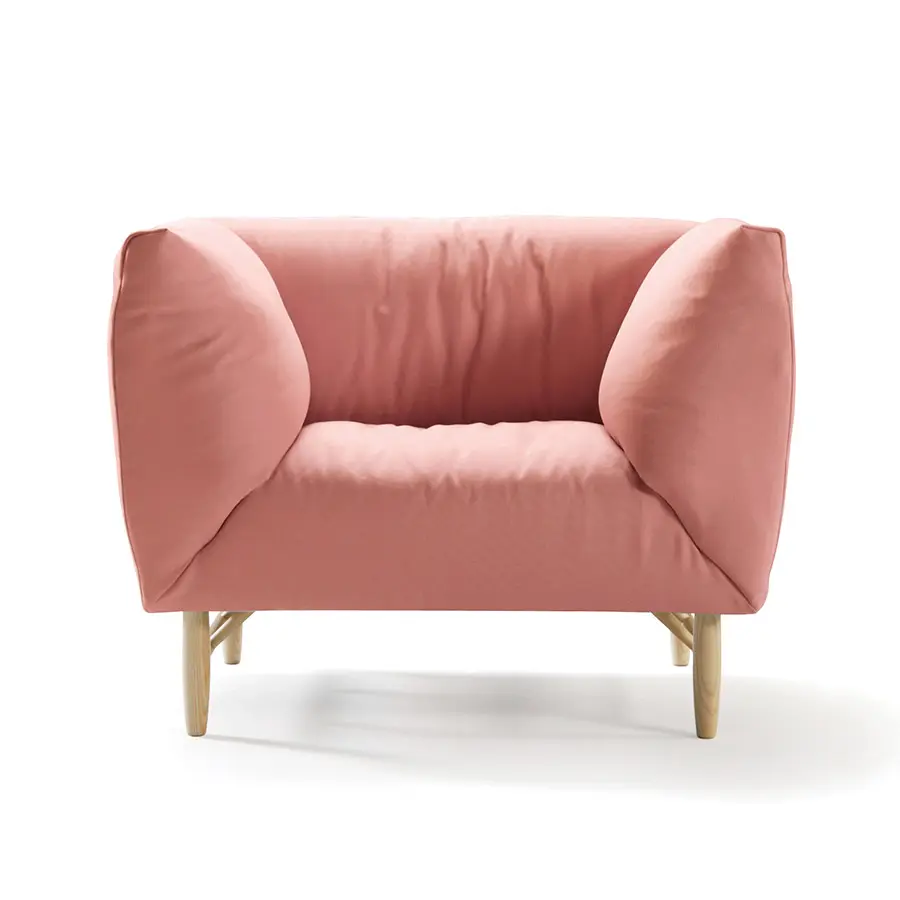 De Copla también destacamos la suavidad de sus formas y sus ahuecadas almohadas. Formalmente el diseño surge de la voluntad de crear un sofá con cómodos cojines y esbeltas patas de madera. Las almohadas se unen entre ellas mediante las patas que las sustentan aligerando al máximo su estructura interna y dando lugar a un sofá mórbido por todos y cada uno de sus lados.