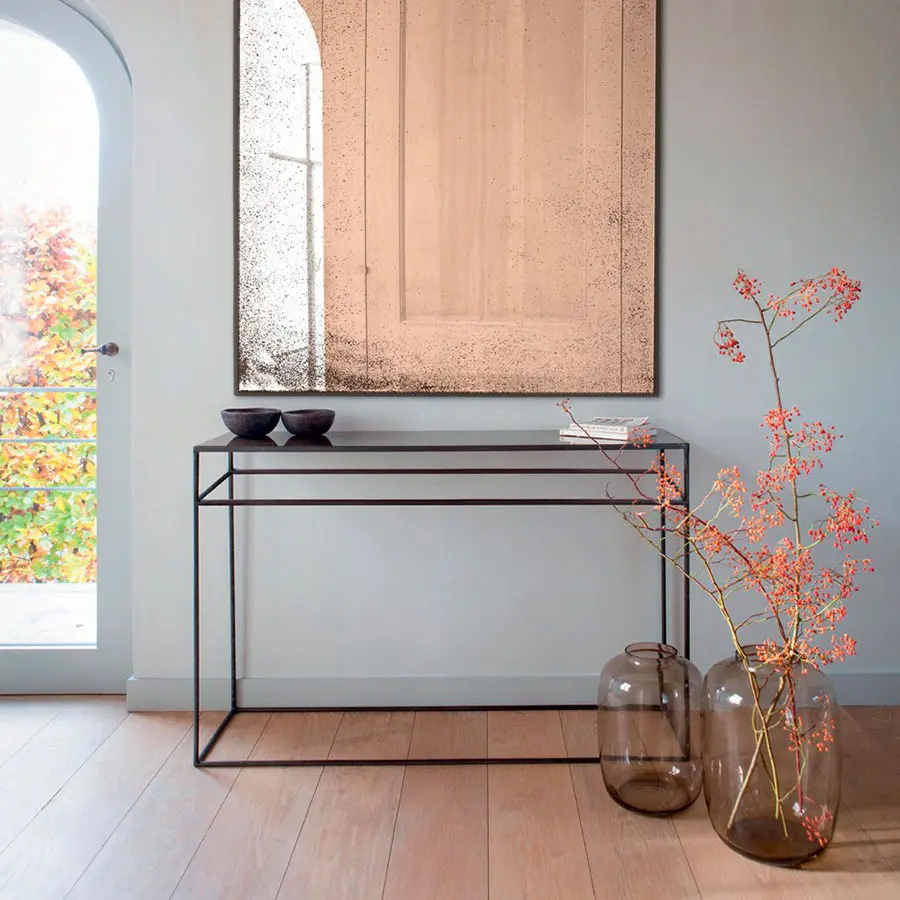 La elegante simplicidad de esta consola es un valor añadido a su hogar. El diseño alto y delgado del marco puede complementar casi cualquier estilo de decoración. Su gran superficie de espejo, a su vez, es el lugar perfecto para exhibir todo tipo de objetos También como su propio nombre indica, es la consola ideal para colocar en la trasera de un sofá. Disponible en bronce, ahumado y claro.