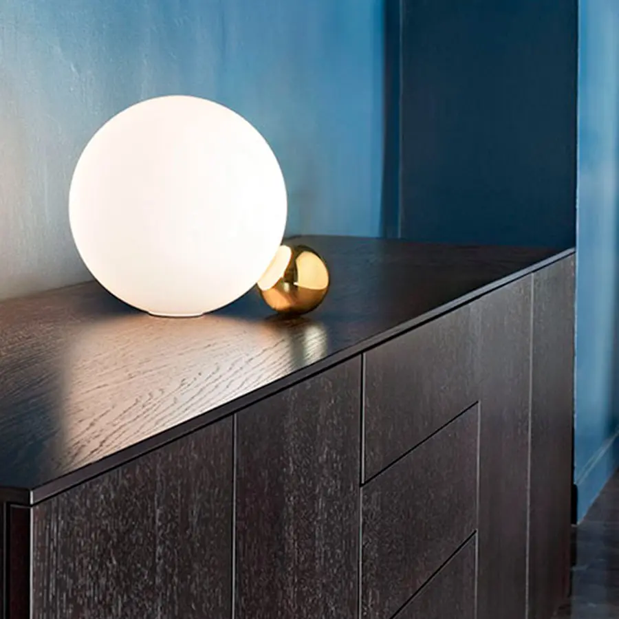 Aparato de iluminación de mesa compuesto por una esfera de aluminio completamente mecanizada y posteriormente sometida a un baño de oro de 24 quilates. Difusor opalino de vidrio soplado. Fuente luminosa de LED con regulador de la intensidad (dimmer) en el cable de alimentación.