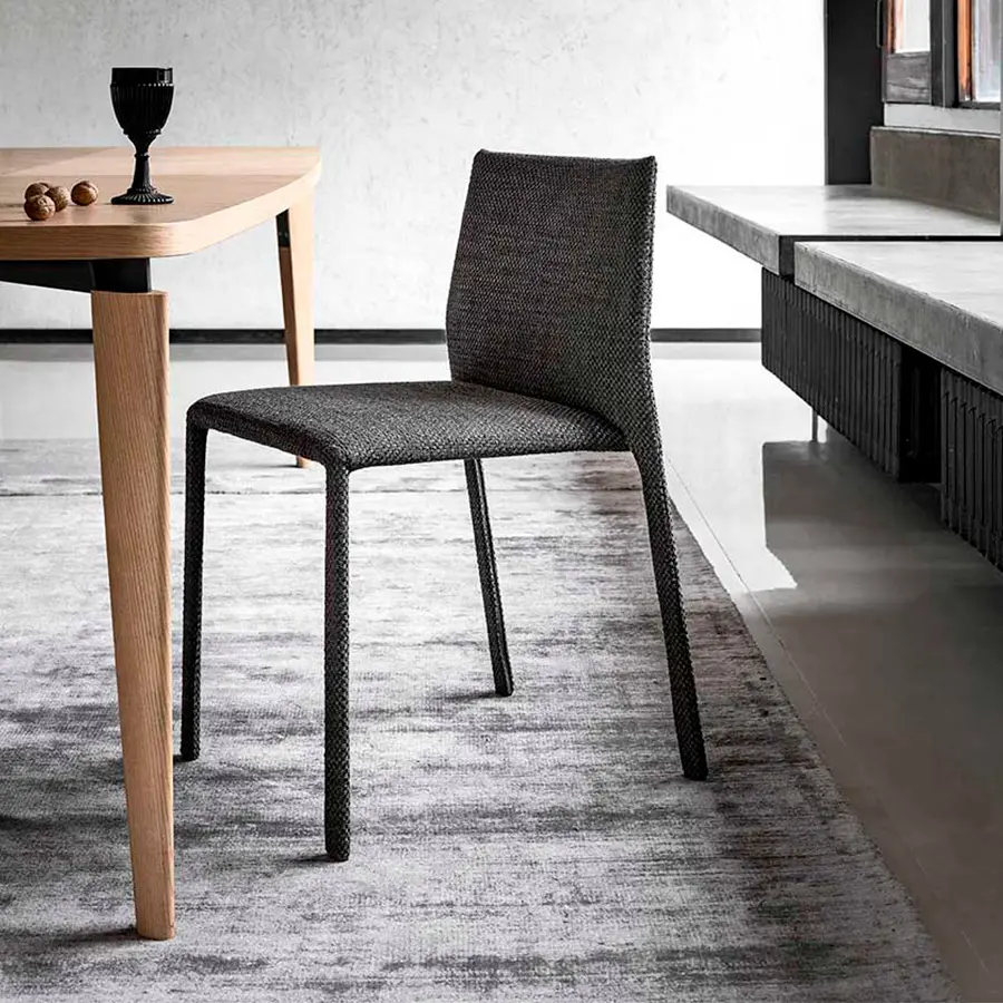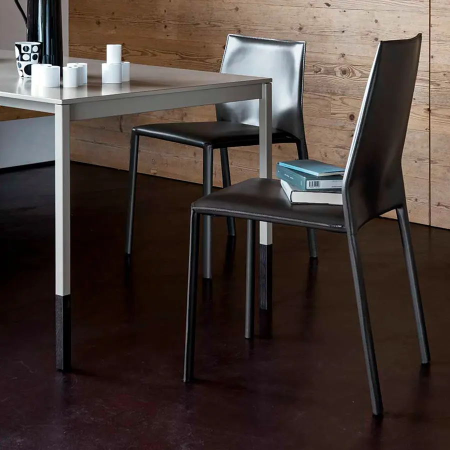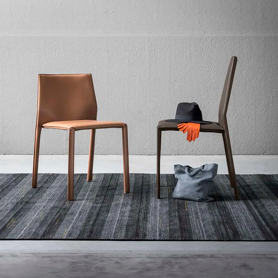 Corium es una silla con una forma muy contenida, disponible con una cubierta de cuero, tela, cuero y cuero ecológico y con un respaldo de 93 cm de alto o más bajo, 80 cm.