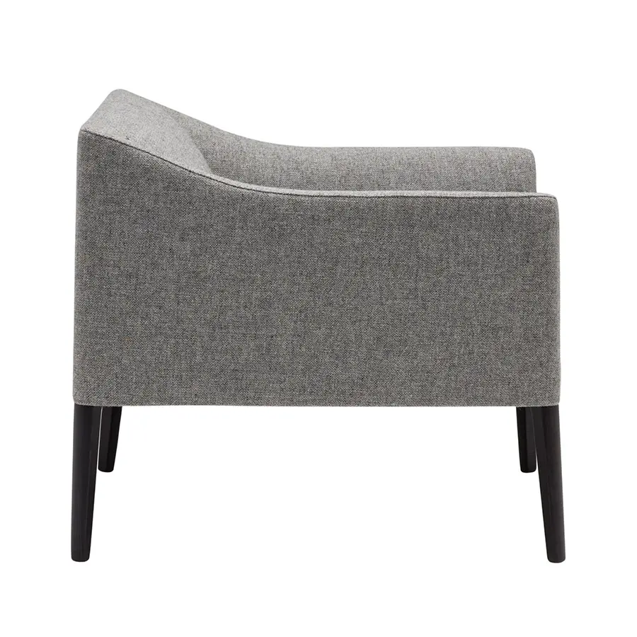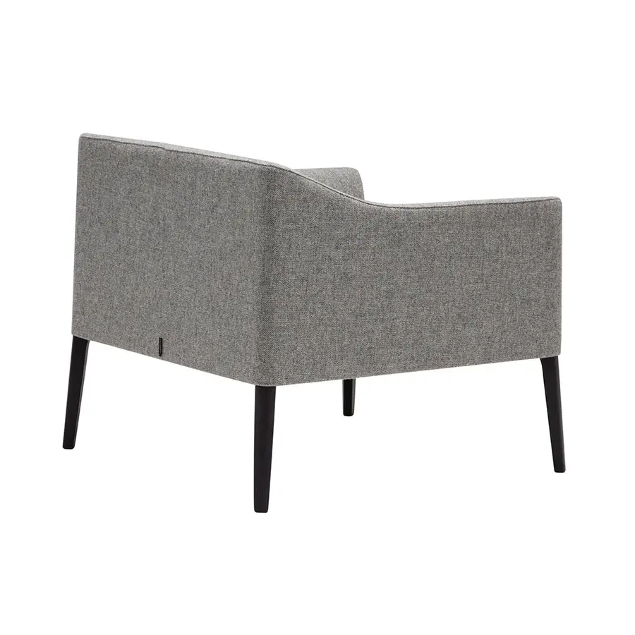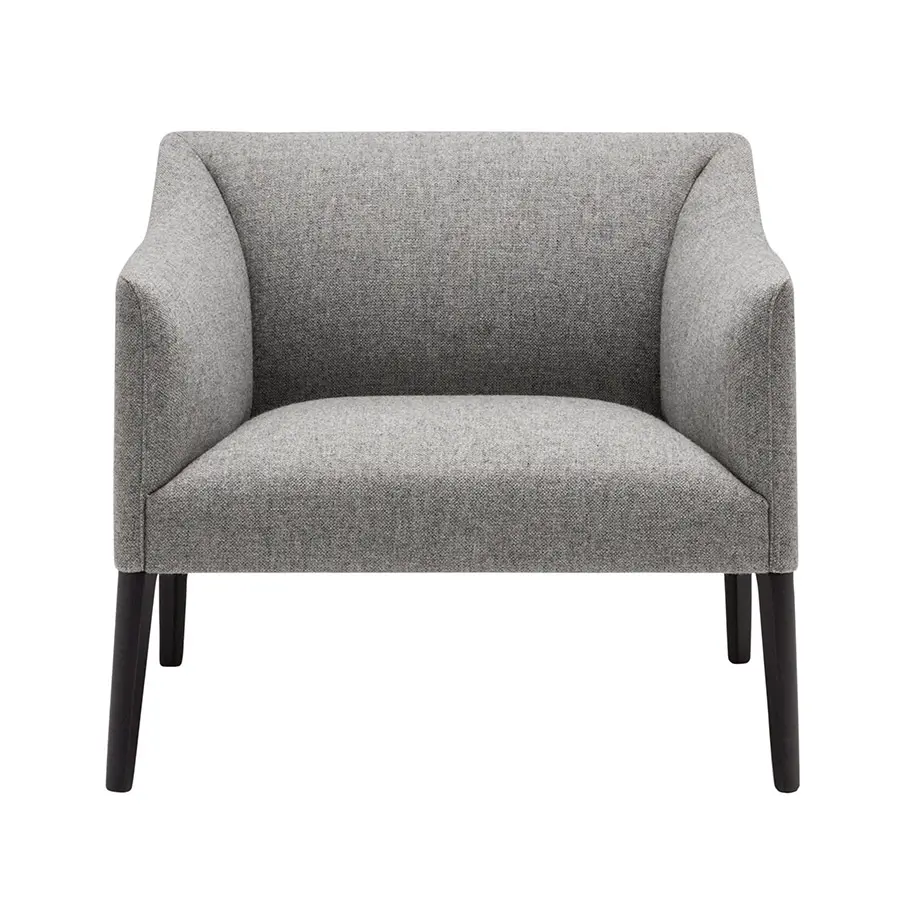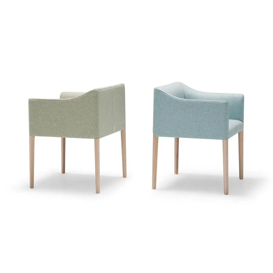 Butaca con asiento y respaldo tapizado y base de 4 patas de madera maciza de haya.