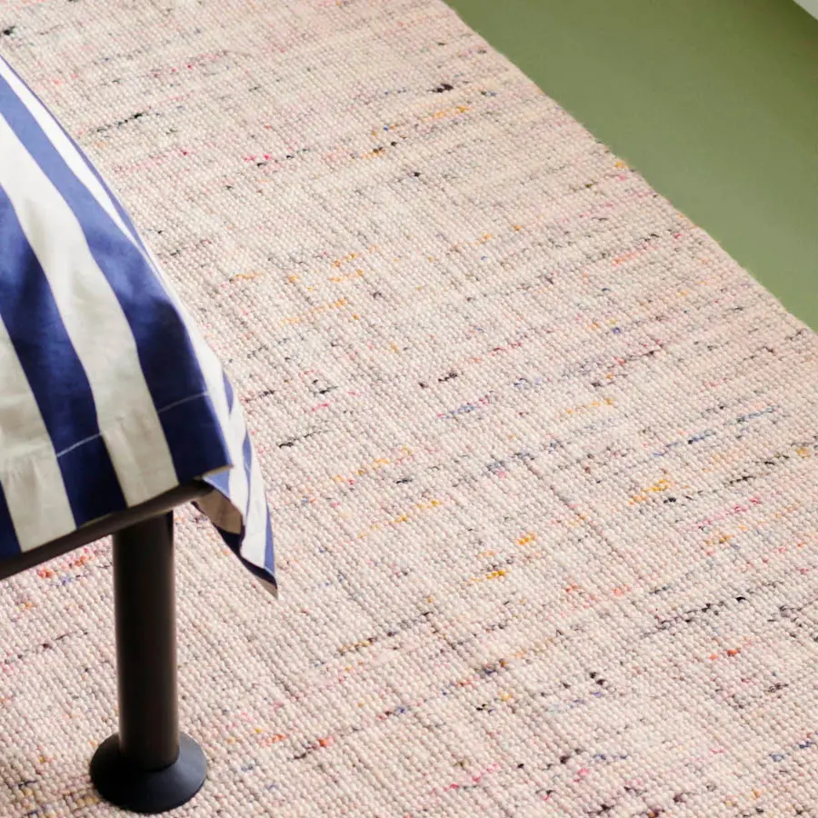 La alfombra Crayon de Hay, elaborado con maestría a partir de una mezcla de lana de Nueva Zelanda, viscosa y algodón tejidos de forma apretada, añade un elemento textural a tu espacio vital. La alfombra complementa cualquier estética interior gracias al fondo neutro, mientras que sutiles motas de colores múltiples recorren toda la superficie, incorporando suavemente una capa adicional de color y textura.
