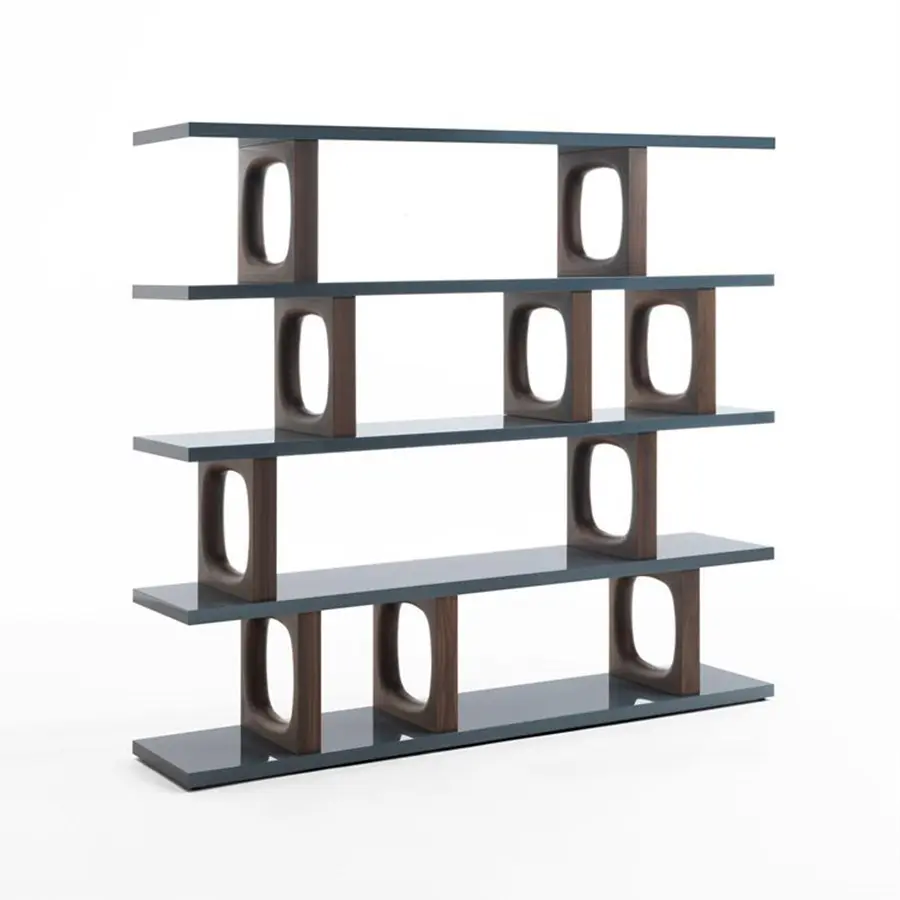 Estantería con soportes de nogal canaletta macizo y dos repisas lacadas poliéster o en nogal canaletta. Dalida, con un ancho de dos metros, está disponible en diferentes alturas – 48H – 92H – 180H – con una profundidad de 43 cm.