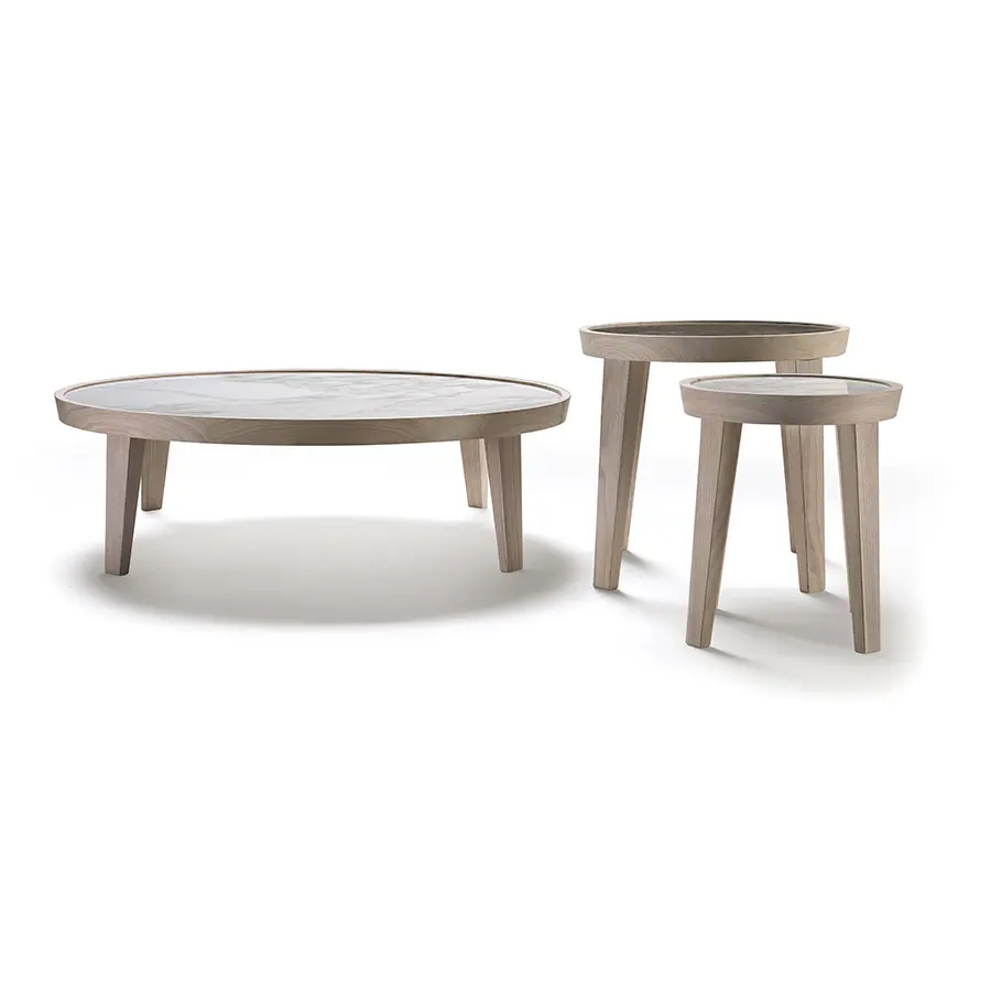 Las mesas de centro Dida muestran claras referencias a la tradición de la ebanistería, aunque revisitadas en clave contemporánea. Las patas de madera maciza, que se caracterizan por una sección cónica, sostienen el tablero de mármol, engastado como una piedra preciosa dentro de un marco también en madera maciza gruesa con borde biselado. La materialidad de la madera de fresno barnizada en varios acabados se encuentra con el refinamiento del mármol, propuesto en las versiones de Calacatta Oro, Emperador, Negro Marquina y Blanco Carrara. La mesa Dida se propone en tres tamaños que amplifican su versatilidad y permiten que se integre en los entornos más diversos en combinación con todos los asientos de la colección Flexform.