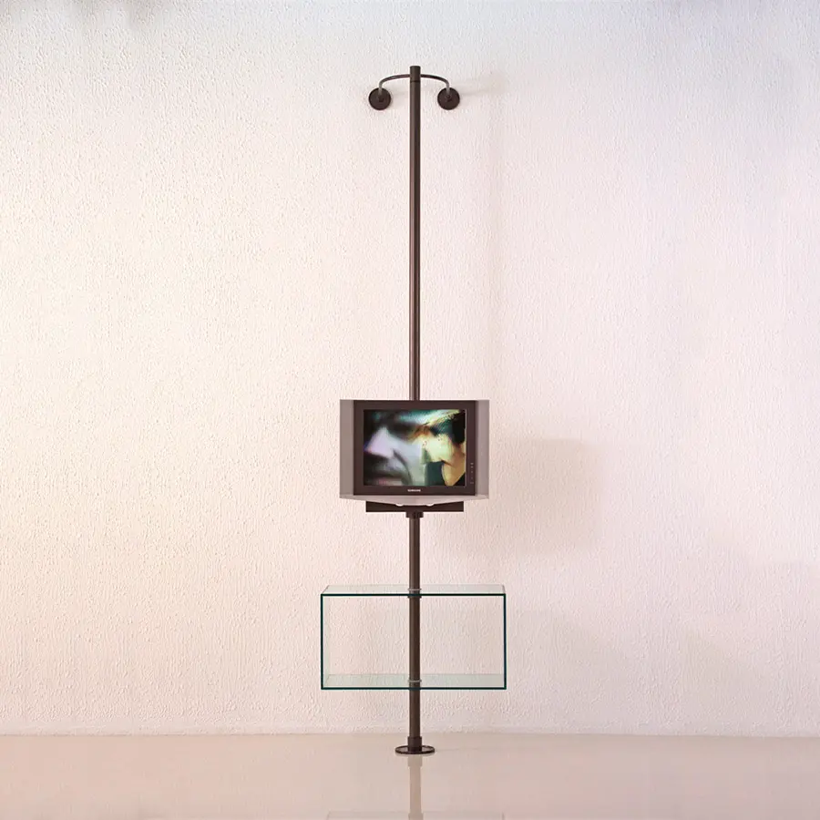 Porta TV compuesto de una columna de metal fijada a la pared o al techo con 8 agujeros pasacables y con placa para fijar el TV. Es posible personalizar la composición con contenedores de cristal o baldas de madera.