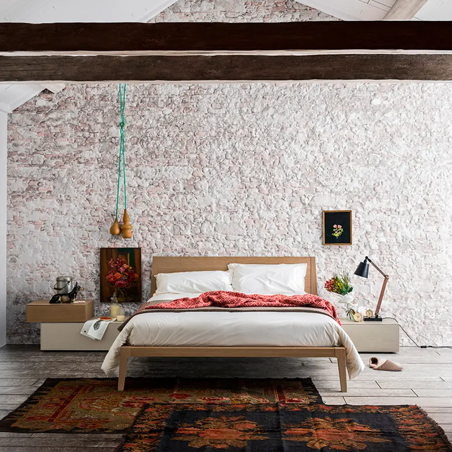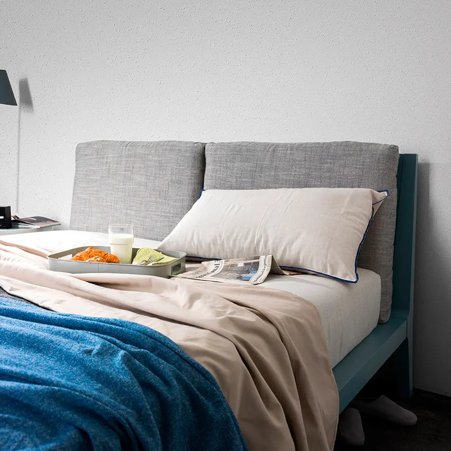 Este modelo se inspira en la recuperación de las formas retro de las camas del pasado, con líneas esbeltas y una estructura que parece desvanecerse. Pero el toque de los espesores en el acabado de la cabecera, en el dibujo de las patas y en la elegante curvatura de todos los elementos la convierten en una auténtico objeto de valor que se puede completar con mullidos cojines para la cabecera.