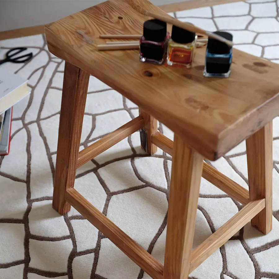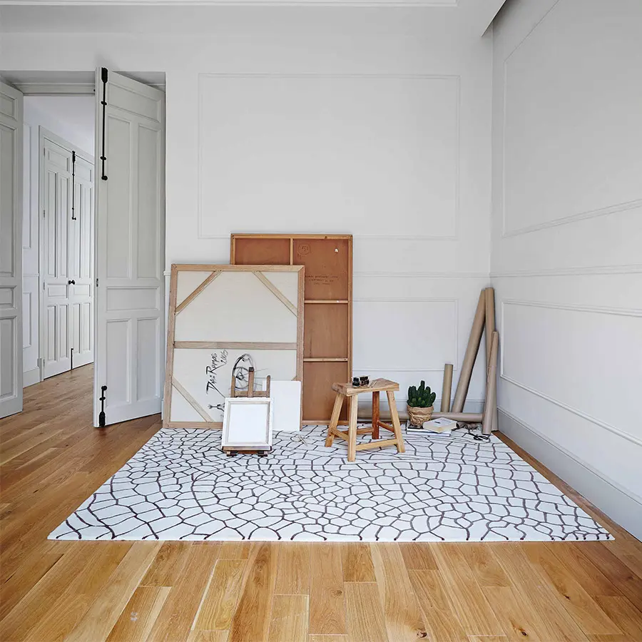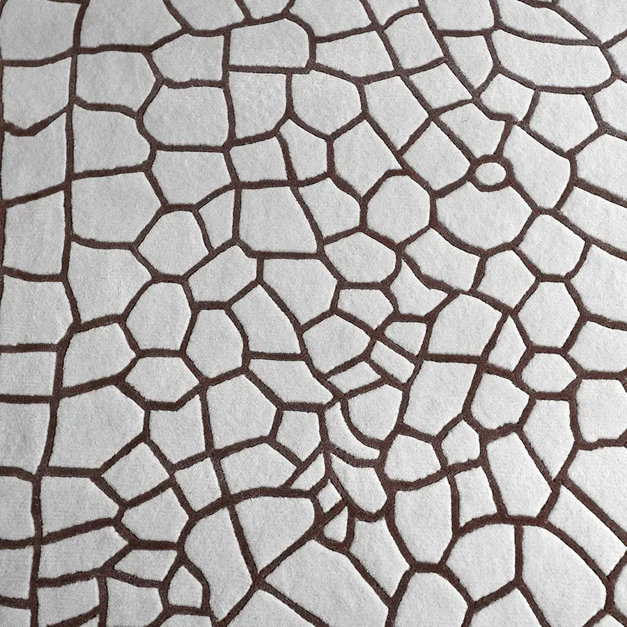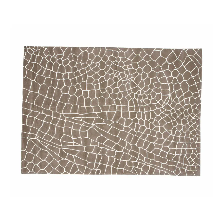 Es una alfombra que se confecciona empleando 100% lana virgen de Nueva Zelanda de color topo y crudo, por lo que resulta una pieza muy suave tanto al tacto como a la pisada. Se encuentra disponible en dos medidas y en otra versión con los tonos invertidos.