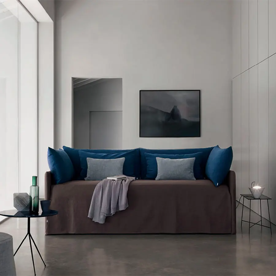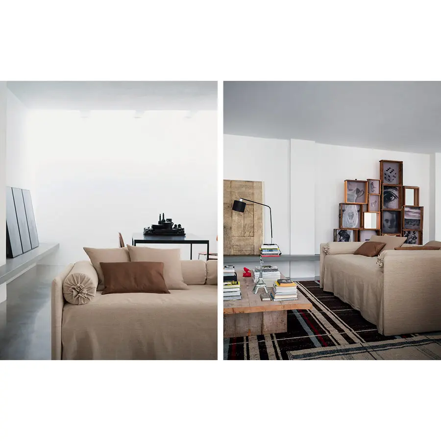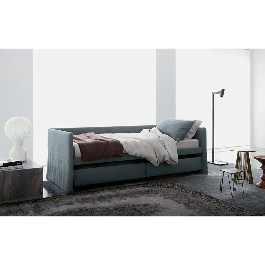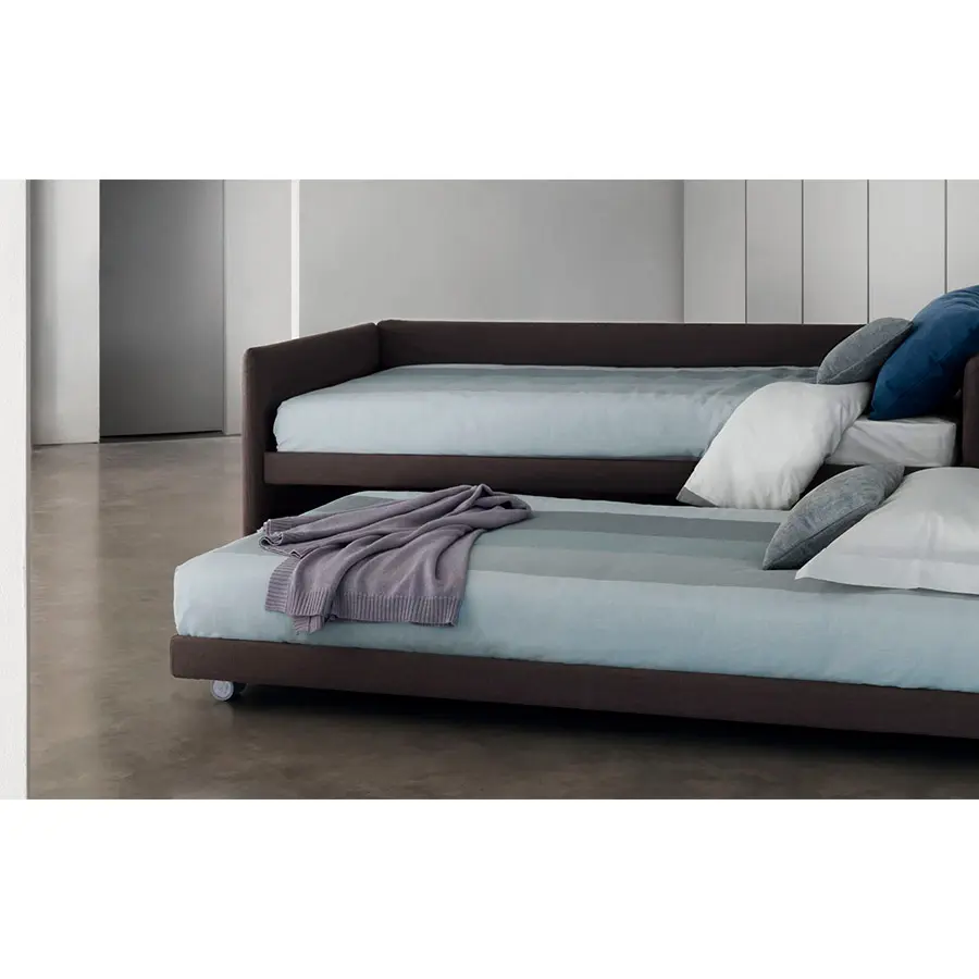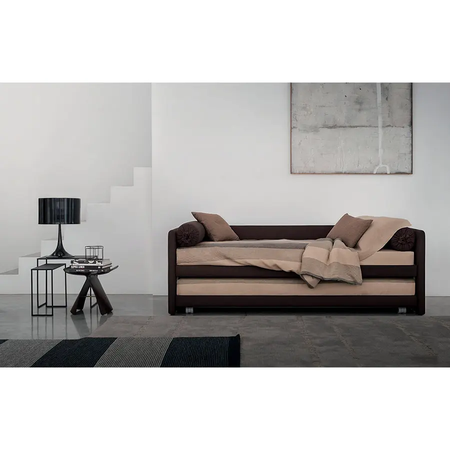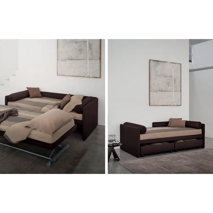 Cama transformable de diseño simple y elegante. Estructura forrada en tejido, piel o Ecopelle, completamente desenfundables. Disponible, con somier de lamas fijas. Cama individual, se convierte fácilmente en una cama matrimonial añadiendo la segunda cama extraible que se eleva gracias a los prácticos pistones a gas y se puede anclar a la primera gracias a dos bloques de acero y goma. Compuesto de funda de asiento, fundas porta almohada y rulos, puede ser personalizado añadiendo el respaldo. Desde el 2014 está disponible también la versión ‘shabby chic’ del revestimiento, con cojines modulados que le añaden confort al asiento cuando se utilize como cama o sofá.