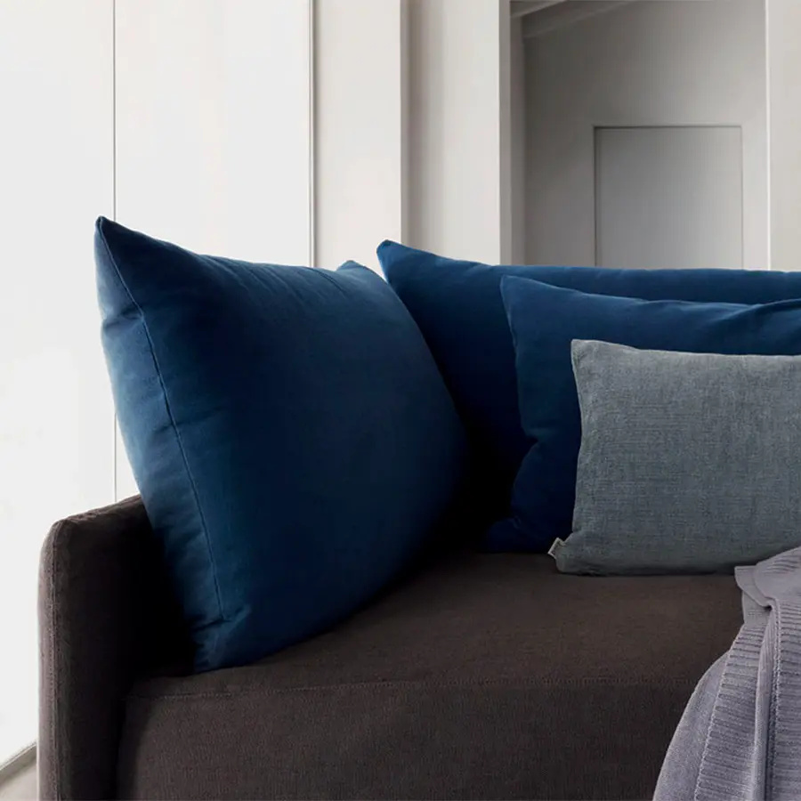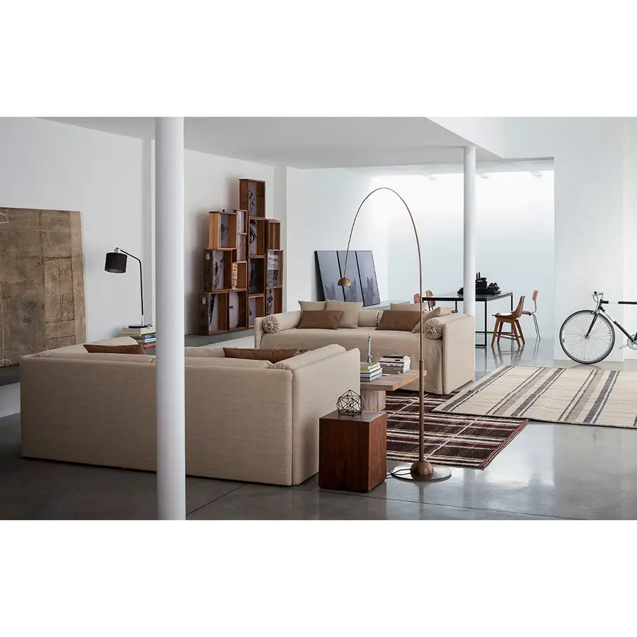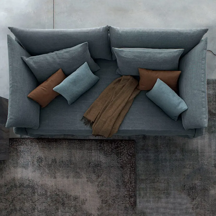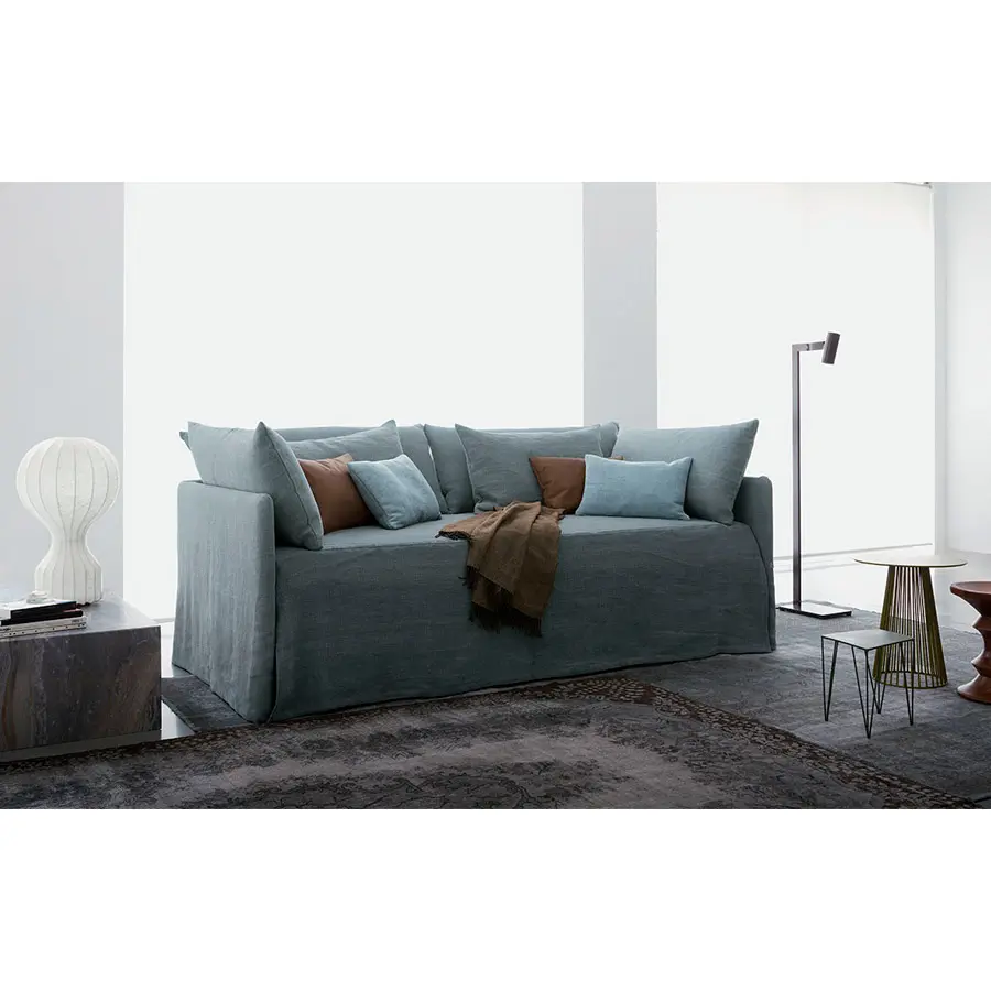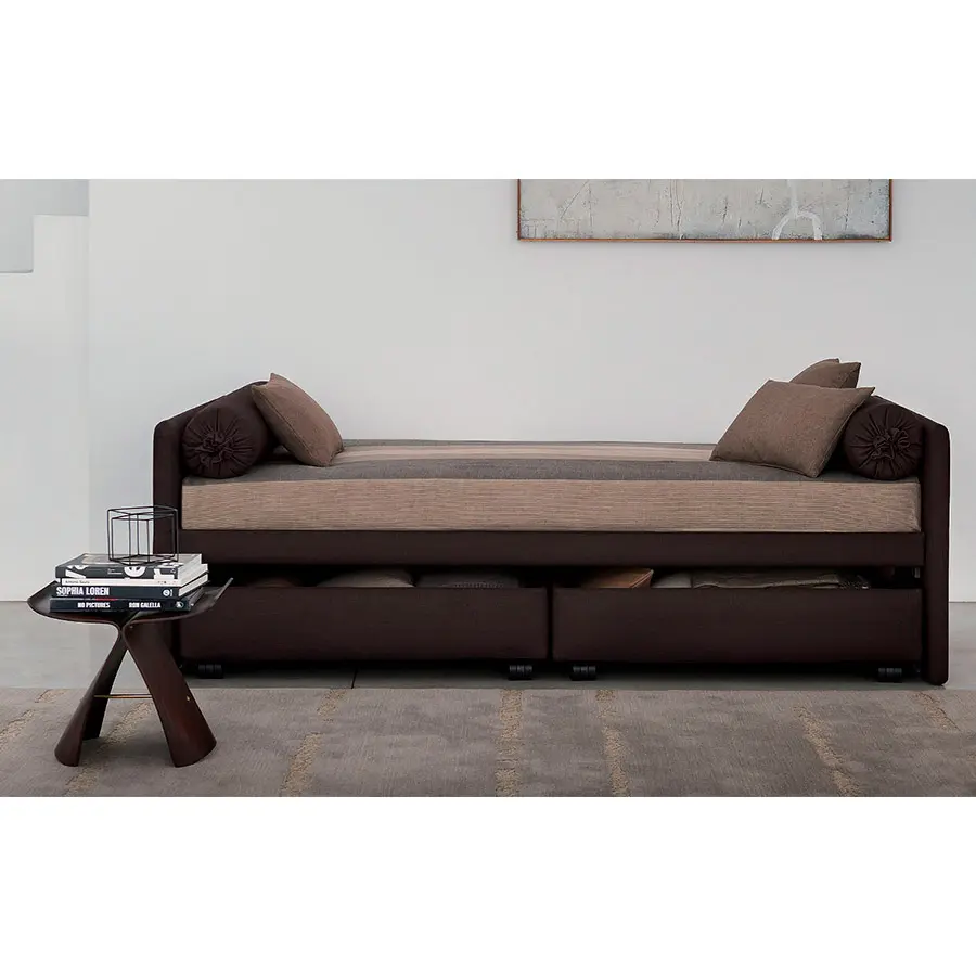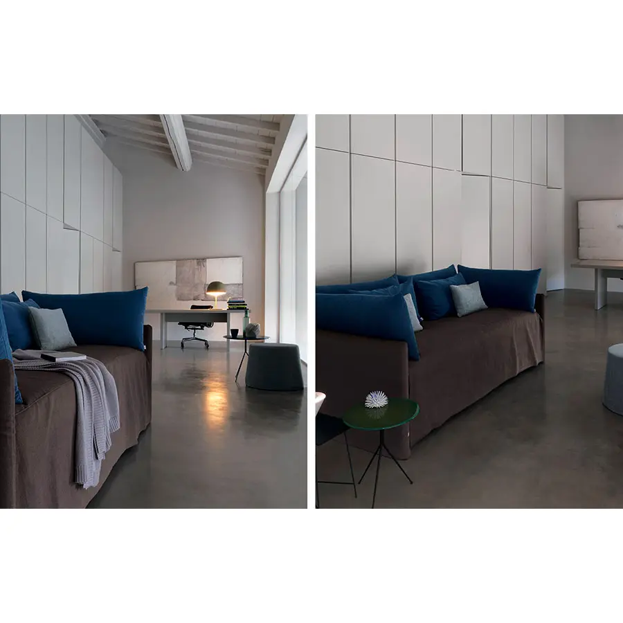 Cama transformable de diseño simple y elegante. Estructura forrada en tejido, piel o Ecopelle, completamente desenfundables. Disponible, con somier de lamas fijas. Cama individual, se convierte fácilmente en una cama matrimonial añadiendo la segunda cama extraible que se eleva gracias a los prácticos pistones a gas y se puede anclar a la primera gracias a dos bloques de acero y goma. Compuesto de funda de asiento, fundas porta almohada y rulos, puede ser personalizado añadiendo el respaldo. Desde el 2014 está disponible también la versión ‘shabby chic’ del revestimiento, con cojines modulados que le añaden confort al asiento cuando se utilize como cama o sofá.