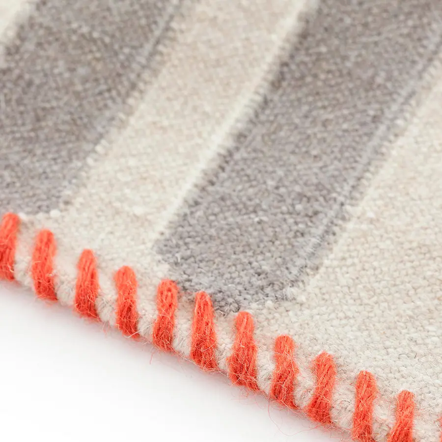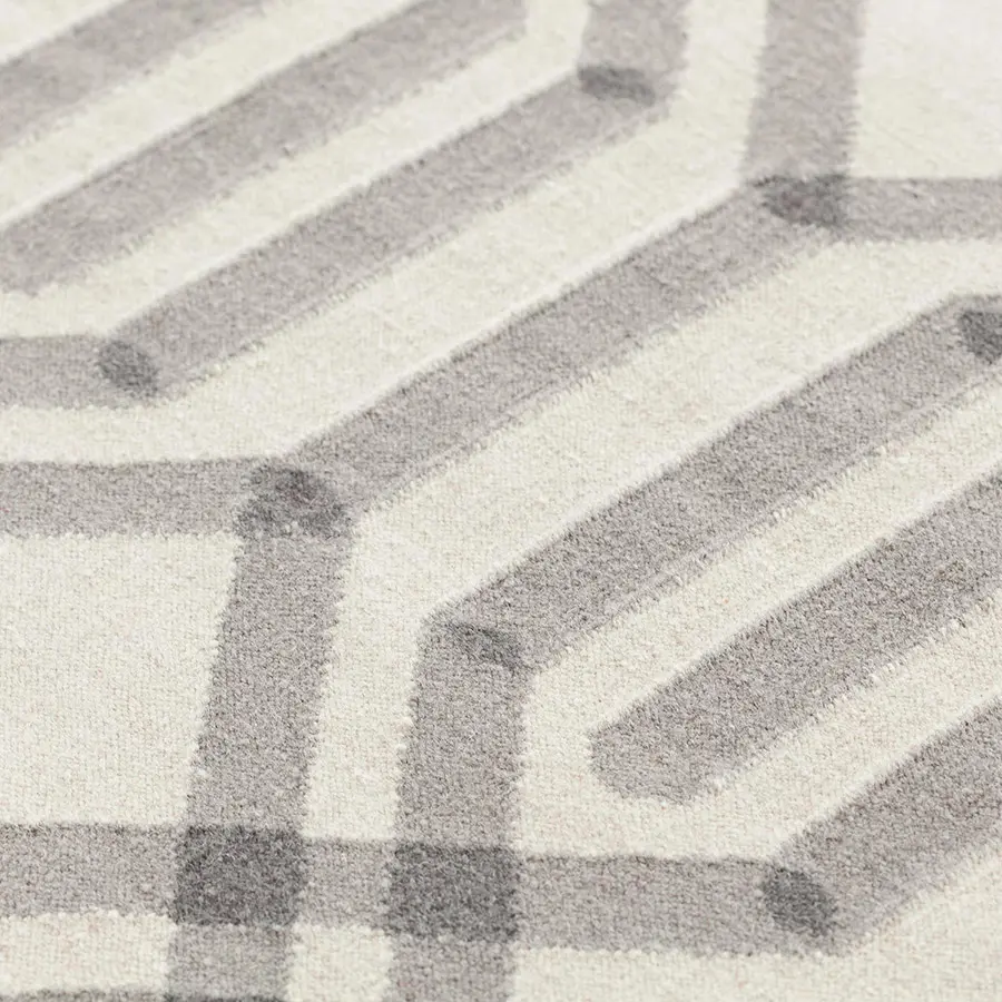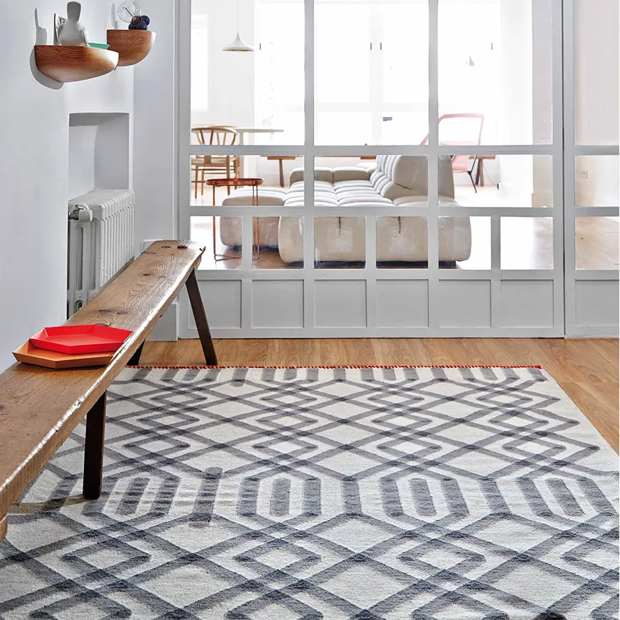 Este es el modelo de alfombra Duna de nuestra colección de kilims, una pieza que también cuenta con una versión de pié de cama y otra de pasillo. Su hipnótico e intrincado diseño de rombos que se entrelazan hasta el infinito, está creado a partir de una sencilla combinación de una serie de líneas rectas y en diagonal. Un esquemático patrón de dibujo geométrico ideado por el estudio Odosdesign. El kilim es un método artesanal de elaboración de alfombras en el que se emplea solamente hilos, entretejiendo firmemente la trama en un telar manual, sin anudar. Debido a este proceso, el resultado es un tejido ligero y con una textura sin pelo, similar a la de las tapicerías. Además, se trata de una técnica que ofrece una gran flexibilidad en el diseño, peculiaridad que en GAN exploramos a fondo para concebir alfombras con dibujos y detalles de gran impacto.