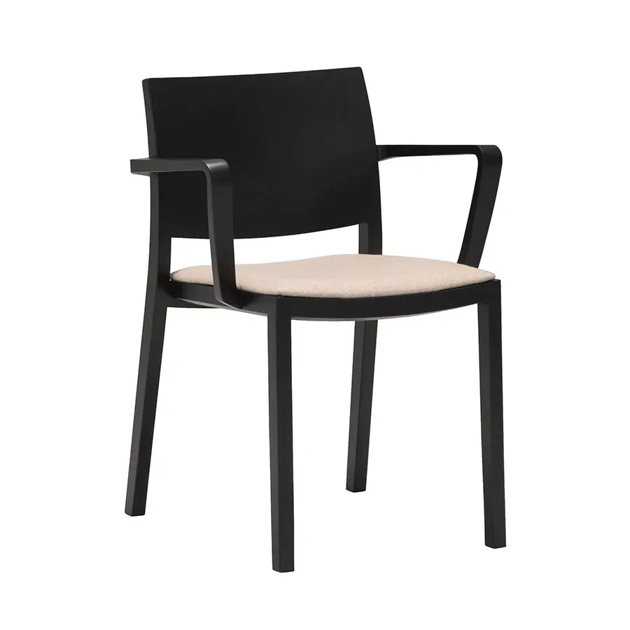Silla apilable con asiento tapizado o en madera, respaldo de tablero contrachapado de haya y estructura de madera maciza de haya.