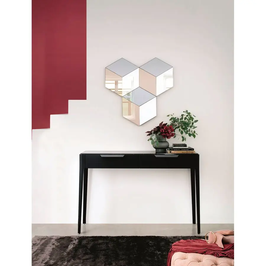 Espejo hexagonal de pared compuesto por tres elementos con acabados diferentes: espejo natural, ahumado y bronceado.