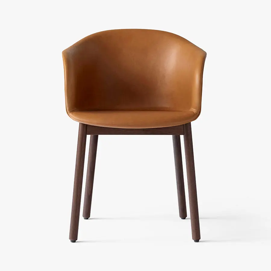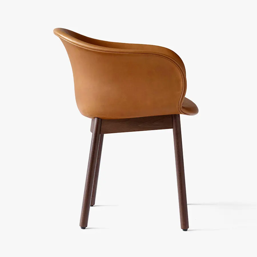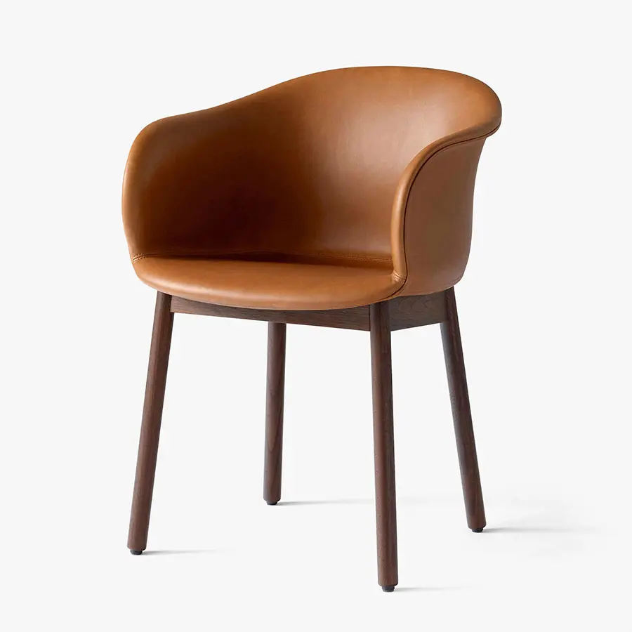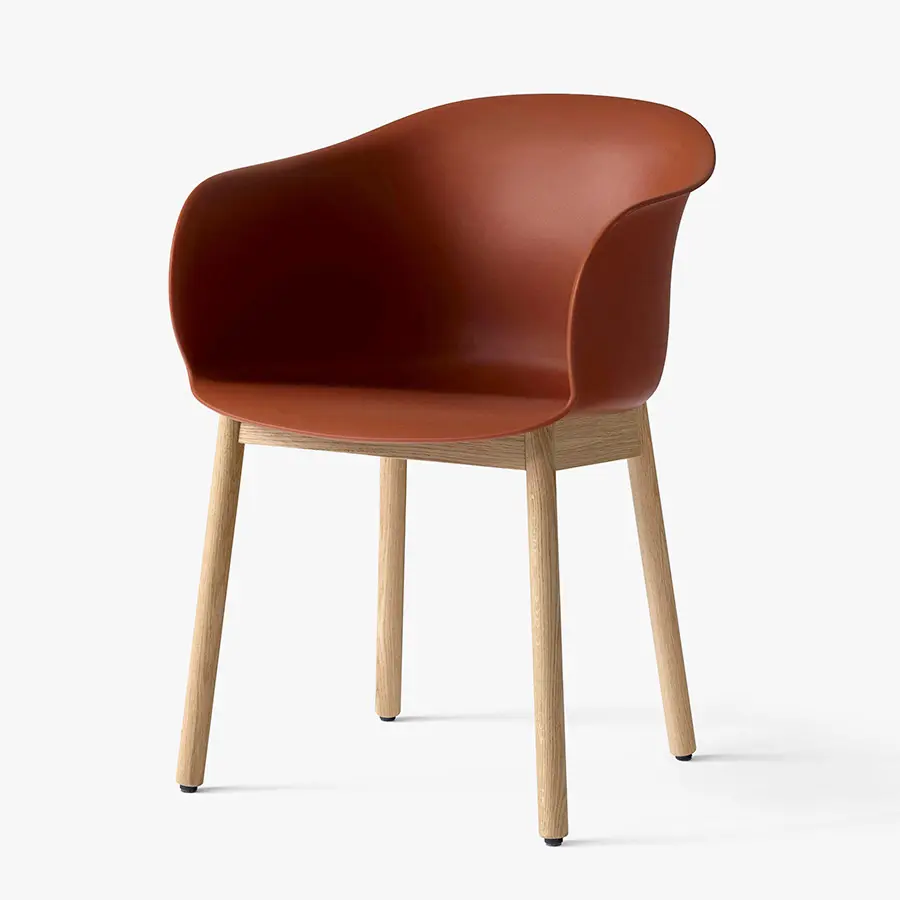 Esta silla se define por una carcasa de asiento suave y acogedora, unida con una base resistente en nogal o roble lacado. Gracias a su cómodo asiento, es perfecta para sentarse durante largos períodos de tiempo para cenar o trabajar. Disponible en distintos colores.