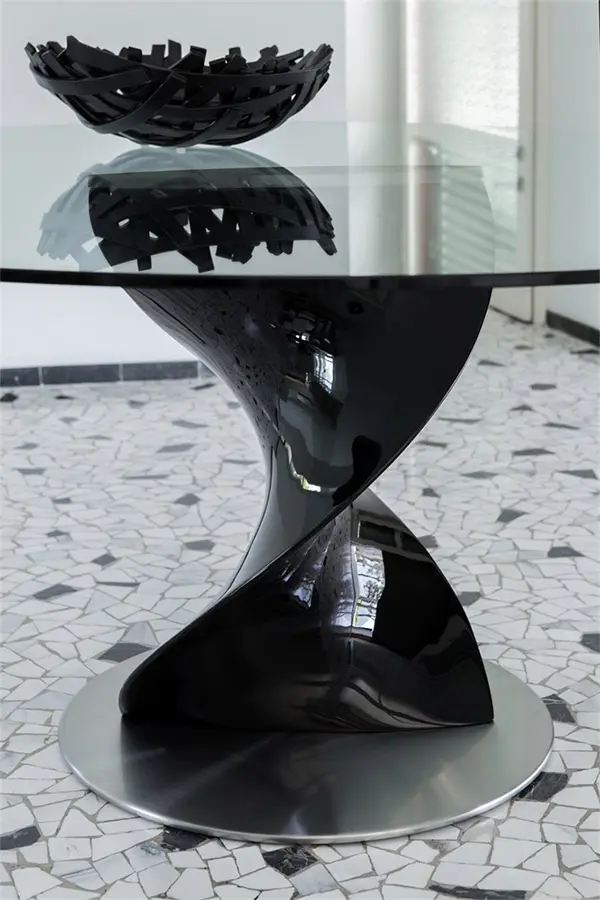 Mesa de comedor con base de tecnopolímero, o nogal canaletta o fresno macizo montada sobre de un disco de metal y tapa de cristal templado (espesor mm. 12). Posibilidad de redonda en diferentes medidas, elíptica con una base de 180×110, elíptica con dos bases en diferentes medidas comprendidas entre dos metros y tres metros y medio. También posibilidad en ovalada o rectangular de dos bases.