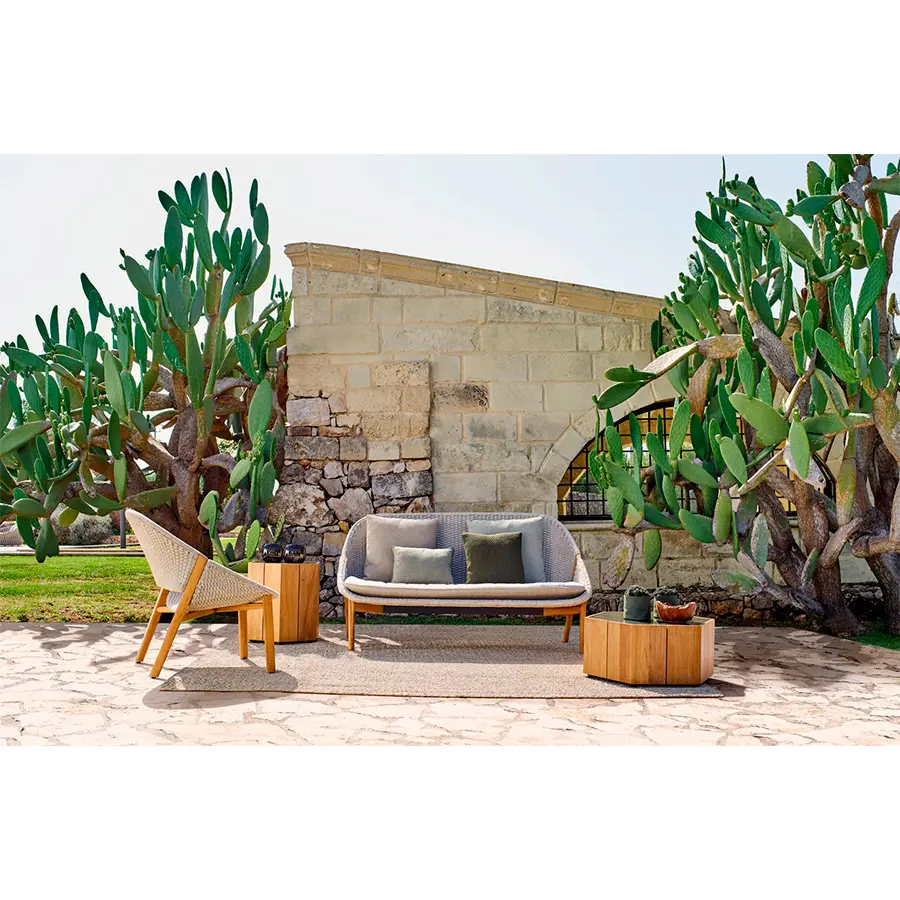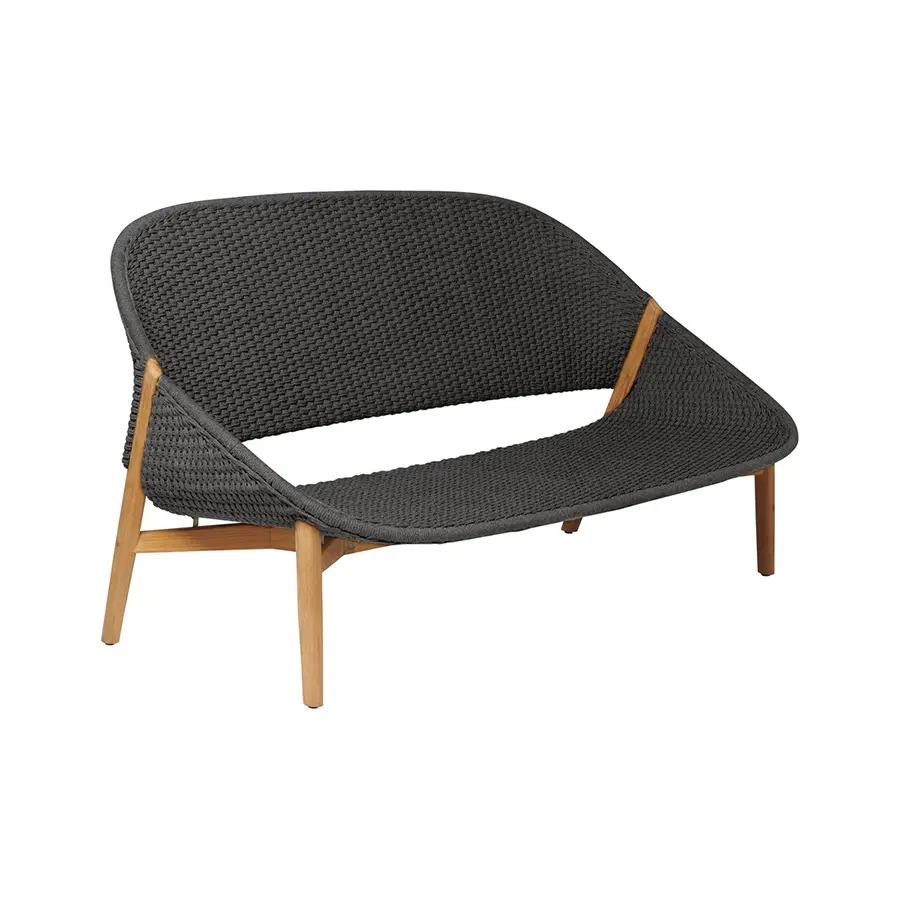 Con su respaldo suavemente curvado, el sofá de dos plazas lleva el cálido efecto envolvente del diseño del Elio un asiento más allá y se convierte en un pequeño sofá perfecto. El marco es de teca natural y ofrece soporte a la estructura del asiento principalmente mediante las patas traseras. El asiento y el respaldo tejidos a mano tienen una forma redondeada hacia arriba y hacia dentro que crea un cálido e íntimo efecto envolvente.