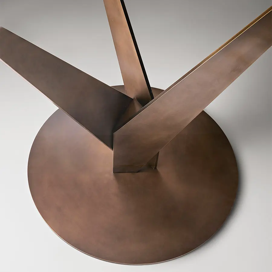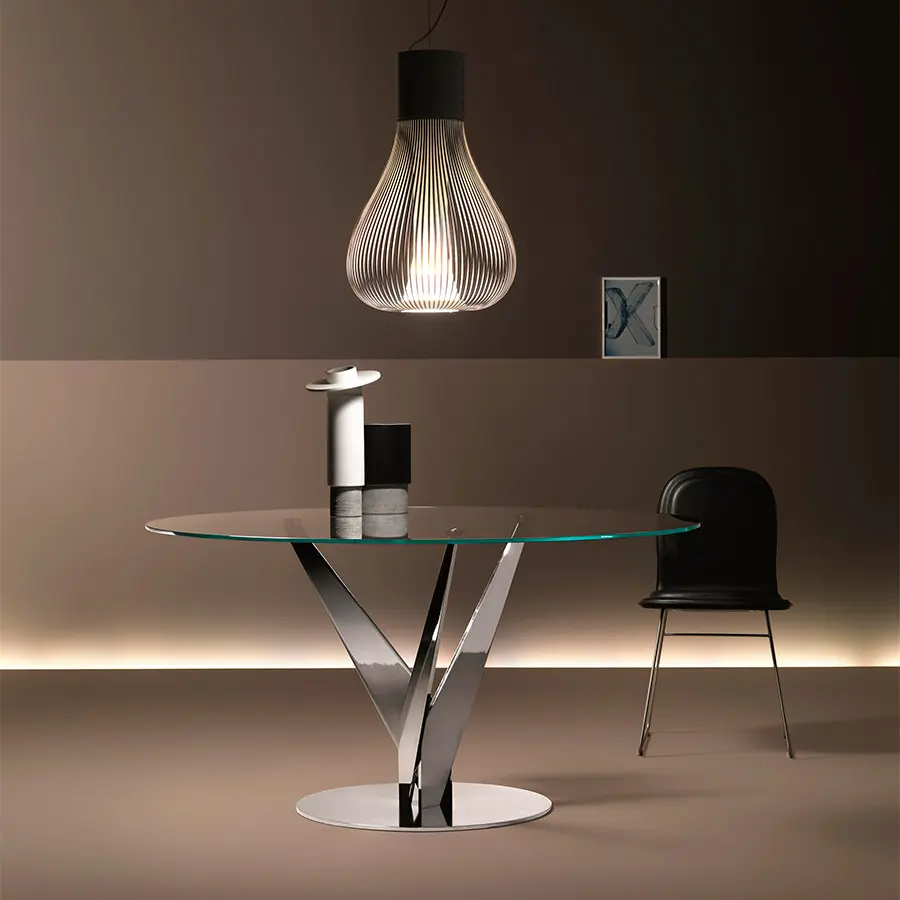Mesa redonda con superficie de vidrio templado transparente, fumé o bronce de 10 mm y estructura con patas de acero de 10 mm cromado o latón bruñido y placas de fijación de acero inoxidable o latón. La mesa Epsylon también se realiza con superficies a medida, de 90 a 140 cm de diámetro.