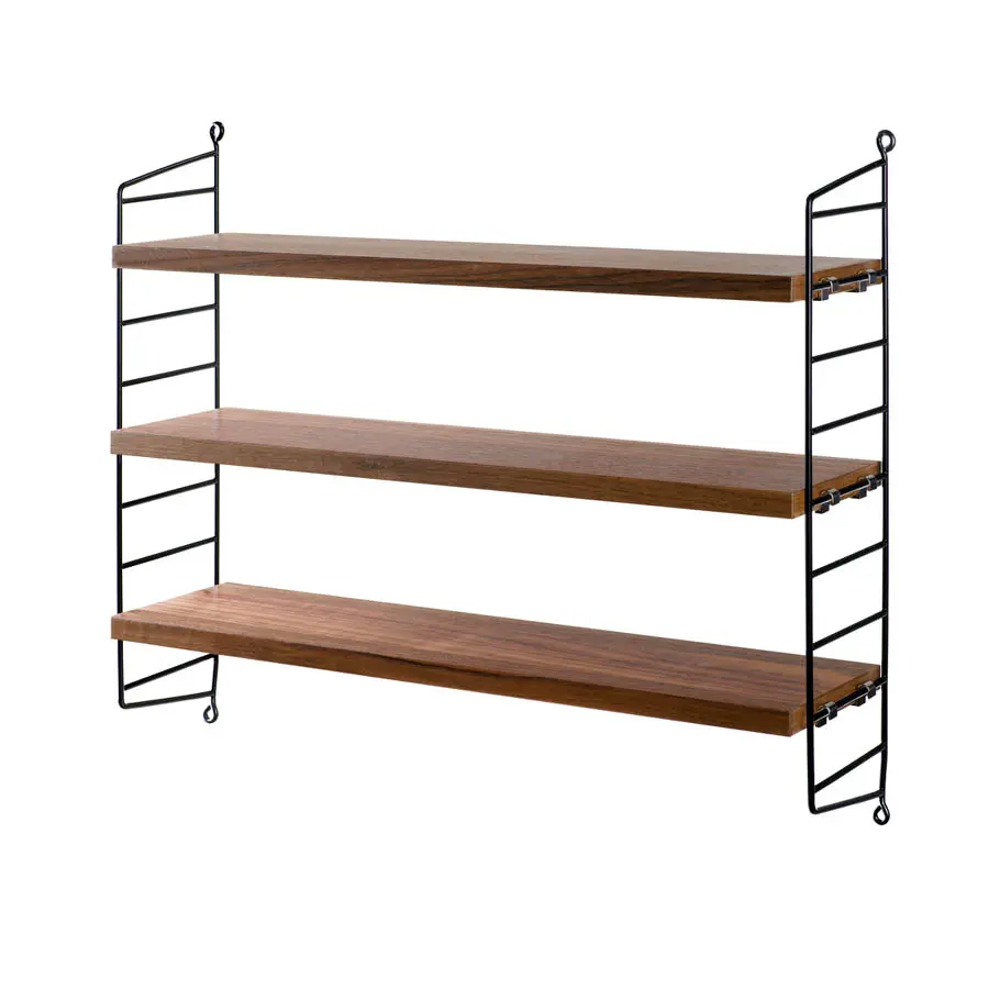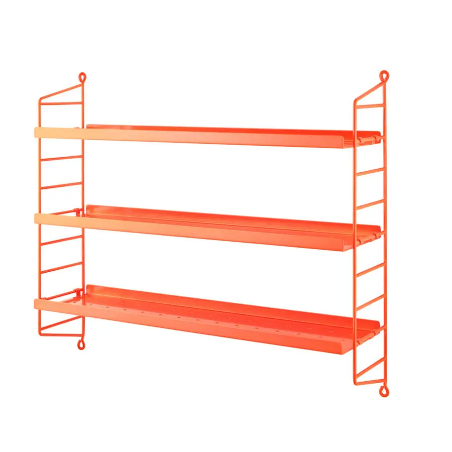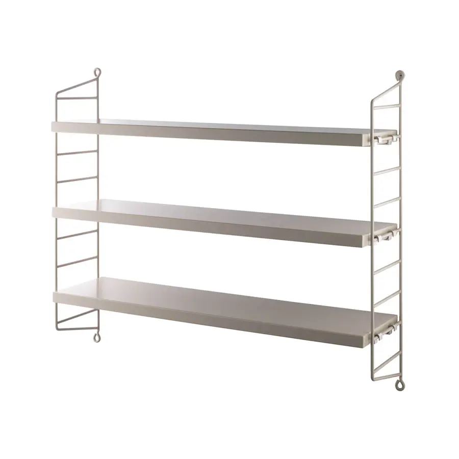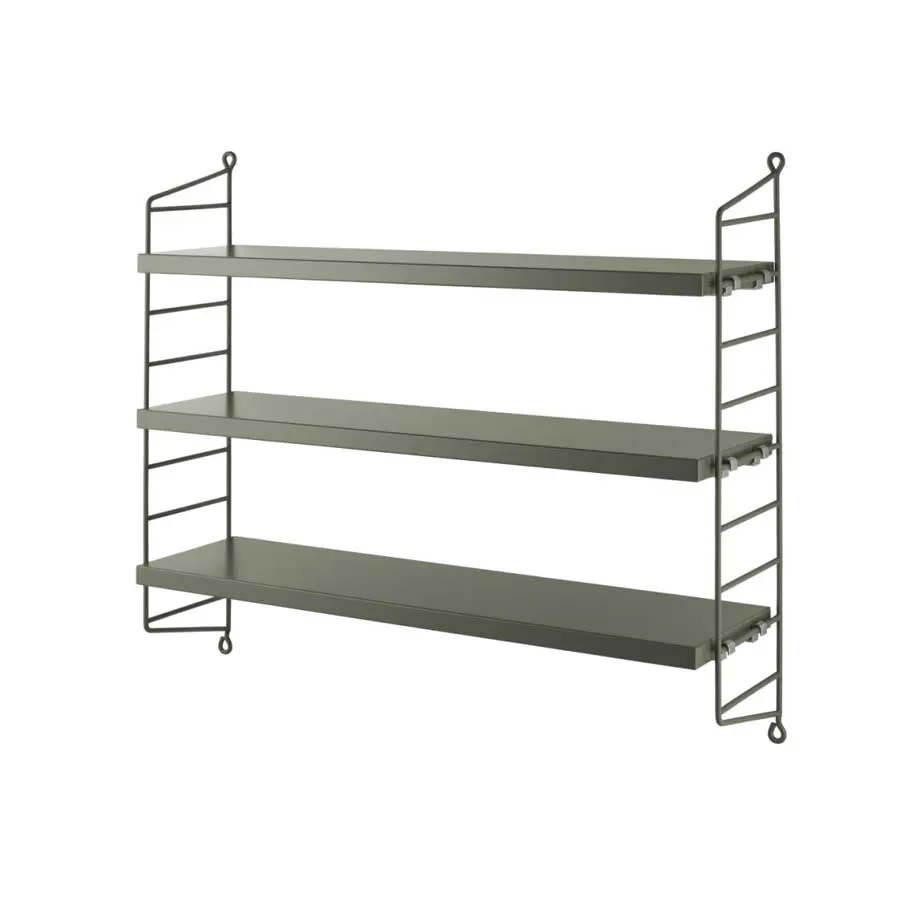 En contraste con el sistema de estanterías String®, String® Pocket se presenta como un paquete completo. Las estanterías String® Pocket se componen de dos paneles de pared y tres estantes disponibles en una variedad de colores. Disponibles desde alternativas monocromáticas en gris, mostaza y otros colores hasta combinaciones con estantes en nogal, fresno, roble o metálicos.