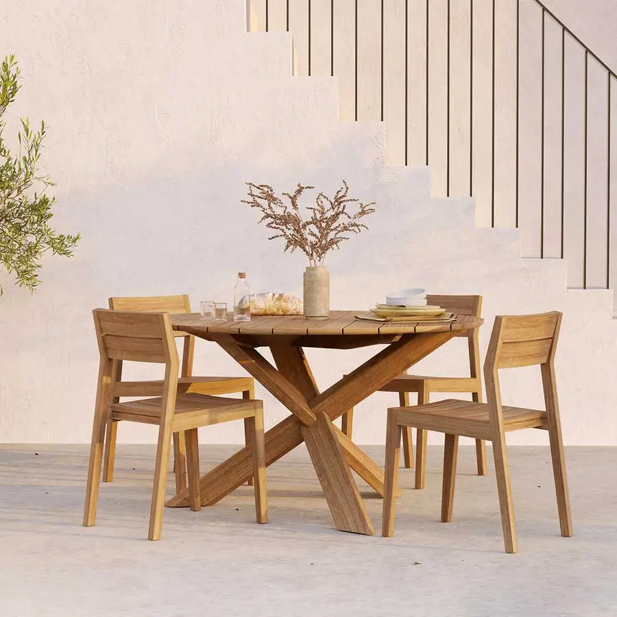 La silla EX es un clásico atemporal, fabricado en madera maciza de teka apta para exterior y en roble para interior.