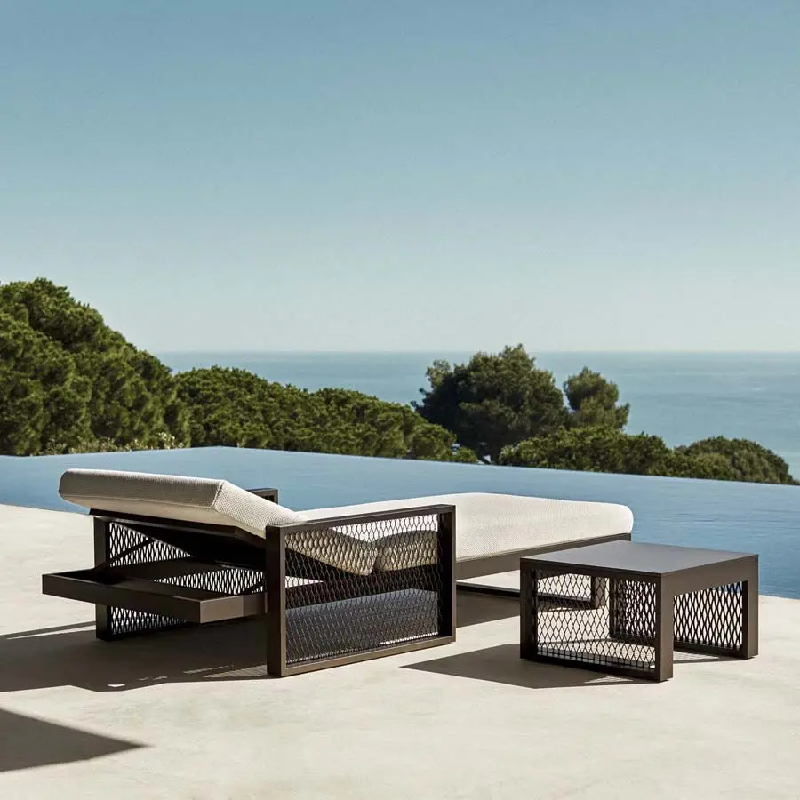 La colección The Factory, diseñada por Ramón Esteve para Vondom, se caracteriza por su estructura en perfil de aluminio y malla de deployé. Descubre esta colección de muebles de aluminio compuesta por un sofá modular, una butaca, una tumbona, una mesita auxiliar, una lámpara, una mesa de café, una mesa alta, sillas y un separador de ambientes.