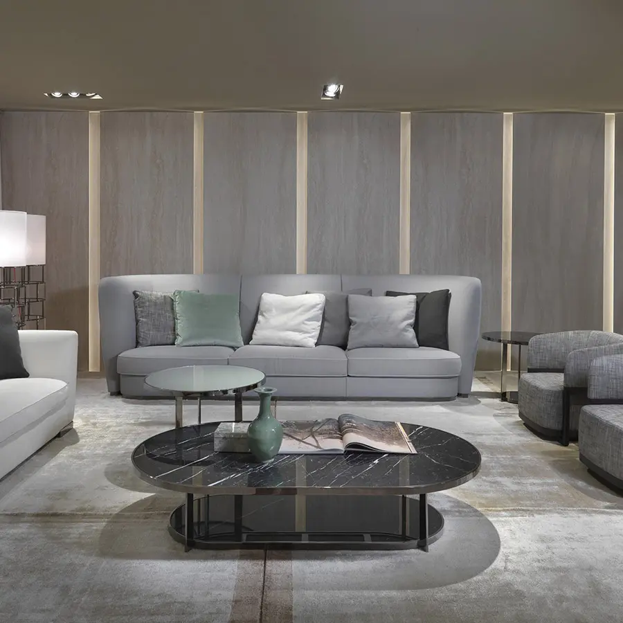 La colección de mesas de centro Fauno se caracteriza por su refinada elegancia y por la extensa presencia de un material precioso como el mármol. La rigurosa estructura metálica está disponible en los acabados satinado, cromado, cromado negro, bronce, bruñido y champán, y enmarca, sosteniéndolos, los dos tableros, el superior y el inferior, ambos de mármol. También está disponible la versión con tableros lacados en una sofisticada gama de colores. Las mesas de centro Fauno están disponibles en diferentes formas y tamaños y se adaptan armoniosamente a cualquier espacio –doméstico o de hostelería– al que dan una nota de decoración moderna.