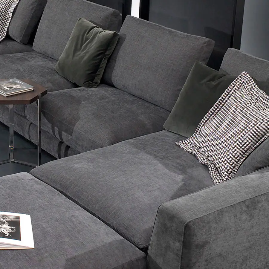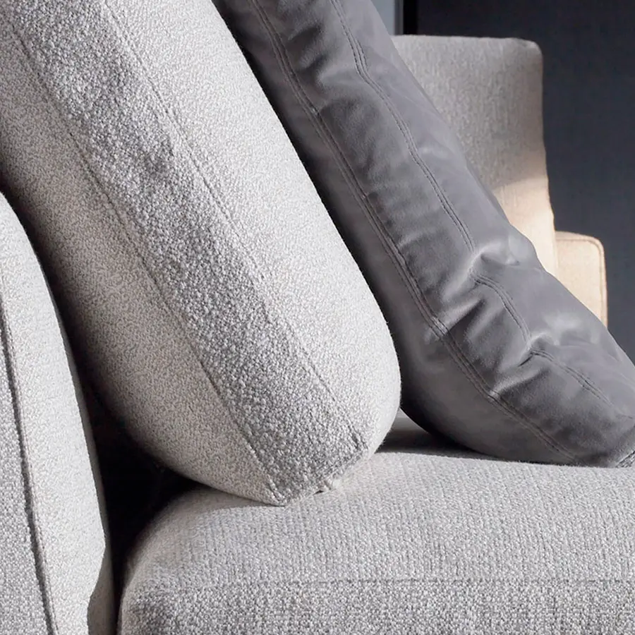 Estructura combinada de madera y tubular de hierro pintado en poliéster. Madera recubierta de espuma de poliuretano de varias densidades y fibra de poliéster. Cojín de asiento en espuma de poliuretano recubierto con una funda protectora rellena de plumas de pato blanco, plumón y fibra de poliéster. Cojines de respaldo revestidos de funda protectora con divisiones internas. Relleno de plumón y pluma de pato blanco esterilizado. Suspensión por correas elásticas. Totalmente desenfundable, excepto cuando se tapiza en piel o su imitación. Estructura desmontable (brazos y respaldos) mediante tornillos.