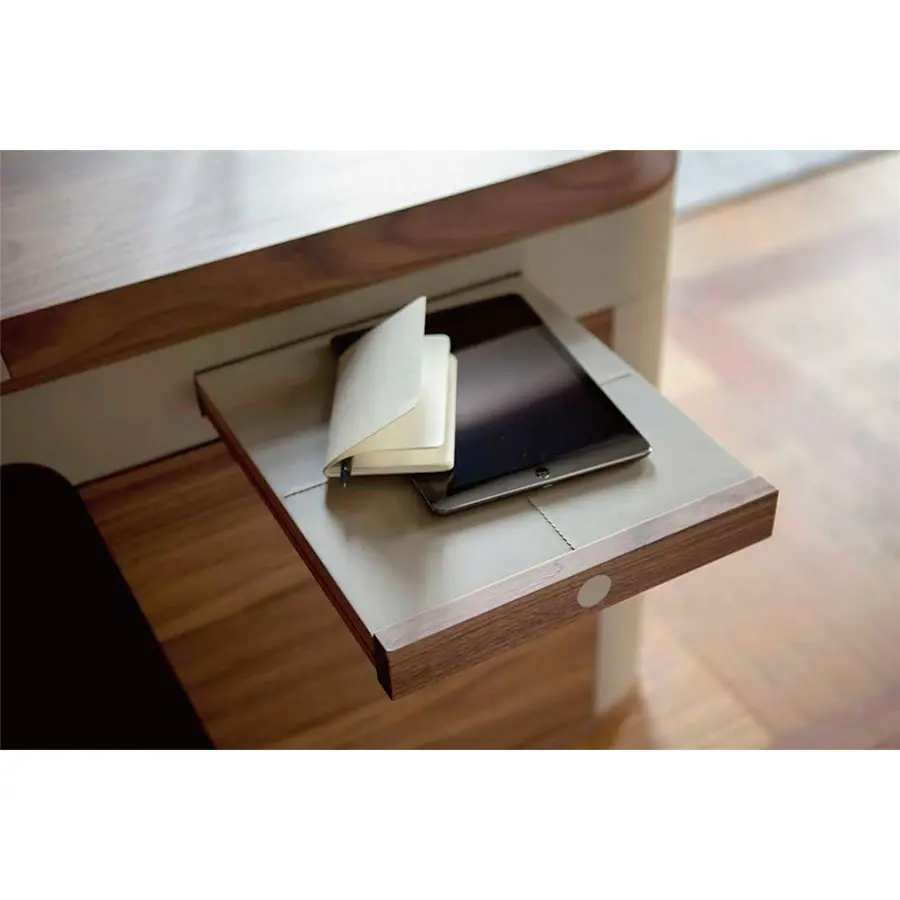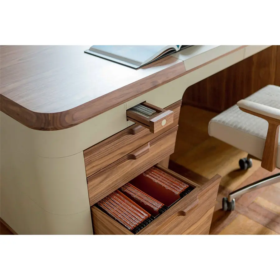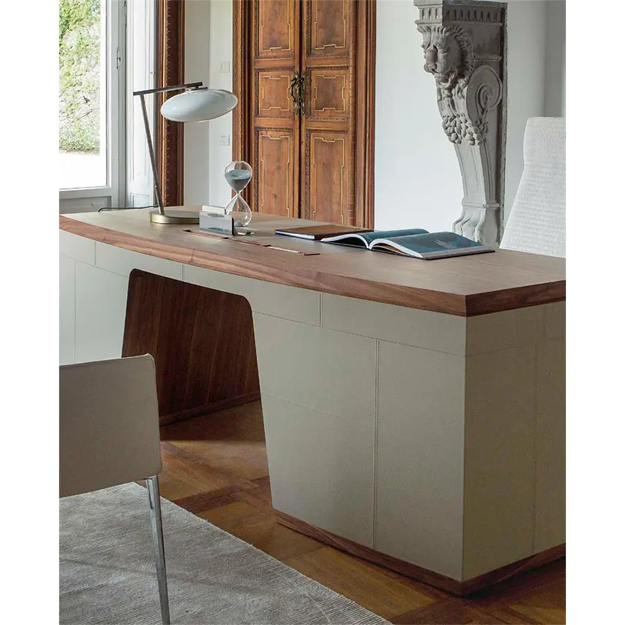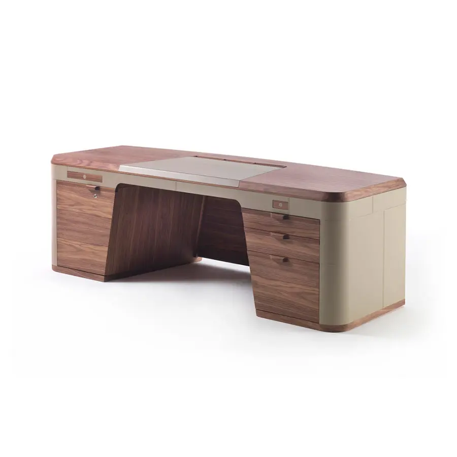 Escritorio de dirección en nogal canaletta con estructura externa revestida de cuoietto y estructura interna de madera. Tapa con inserción de cuoietto con costura en vista. Dotado de algunos compartimientos push/pull, un cajón hondo porta documentos y un elemento con puerta y estante interior. 220×85.5×76