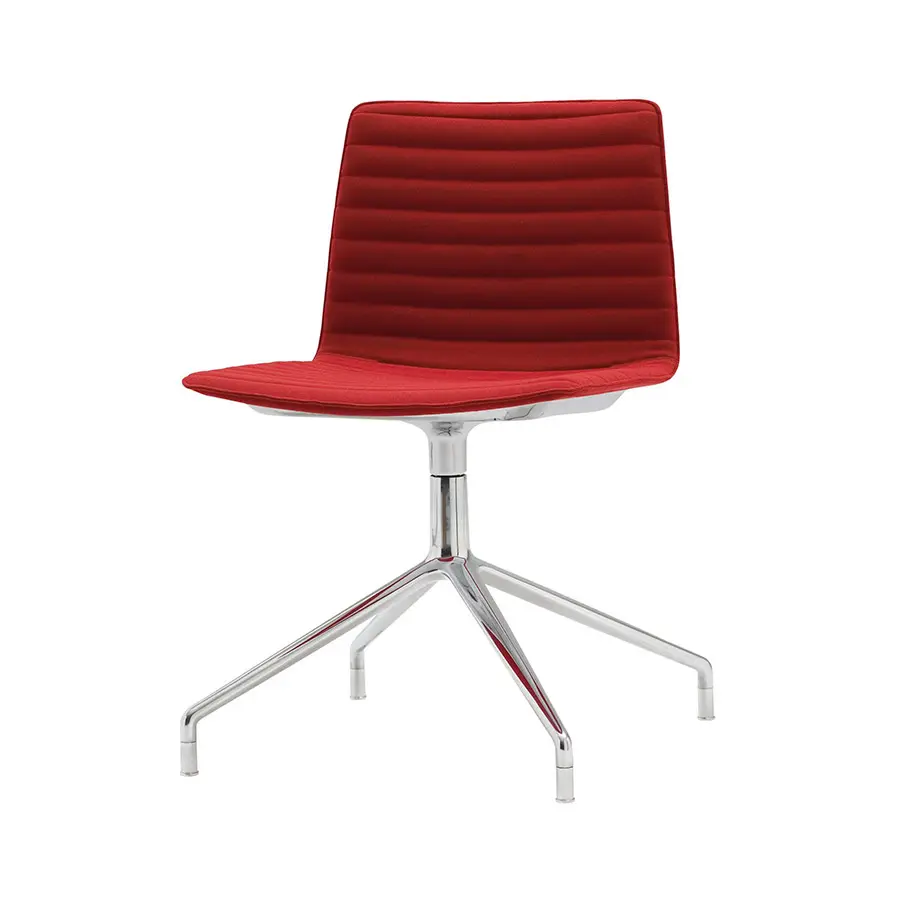 Silla con carcasa de termopolímero disponible en varios colores y base central giratoria de aluminio de 4 aspas con sistema de retorno y acabado aluminio pulido y otros colores de aluminio. Opción de carcasa tapizada con posibilidad de tapizado con costuras paralelas. Dos opciones de respaldo, una de ellas ligeramente más alta para mejorar la sensación de confort.
