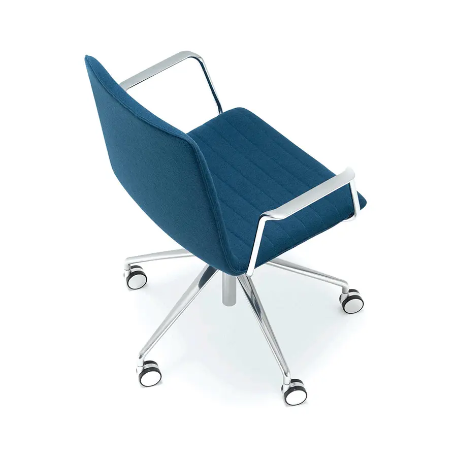 Sillón con carcasa de termopolímero disponible en varios colores y base central giratoria de aluminio de 4 aspas con sistema de retorno y acabado aluminio pulido y otros colores de aluminio. Opción de carcasa tapizada con posibilidad de tapizado con costuras paralelas. Opción de brazos tapizados. Dos opciones de respaldo, una de ellas ligeramente más alta para mejorar la sensación de confort. Opción de sistema basculante. Opción de respaldo en madera de noga.