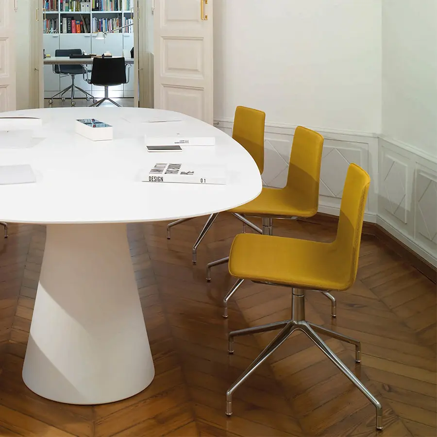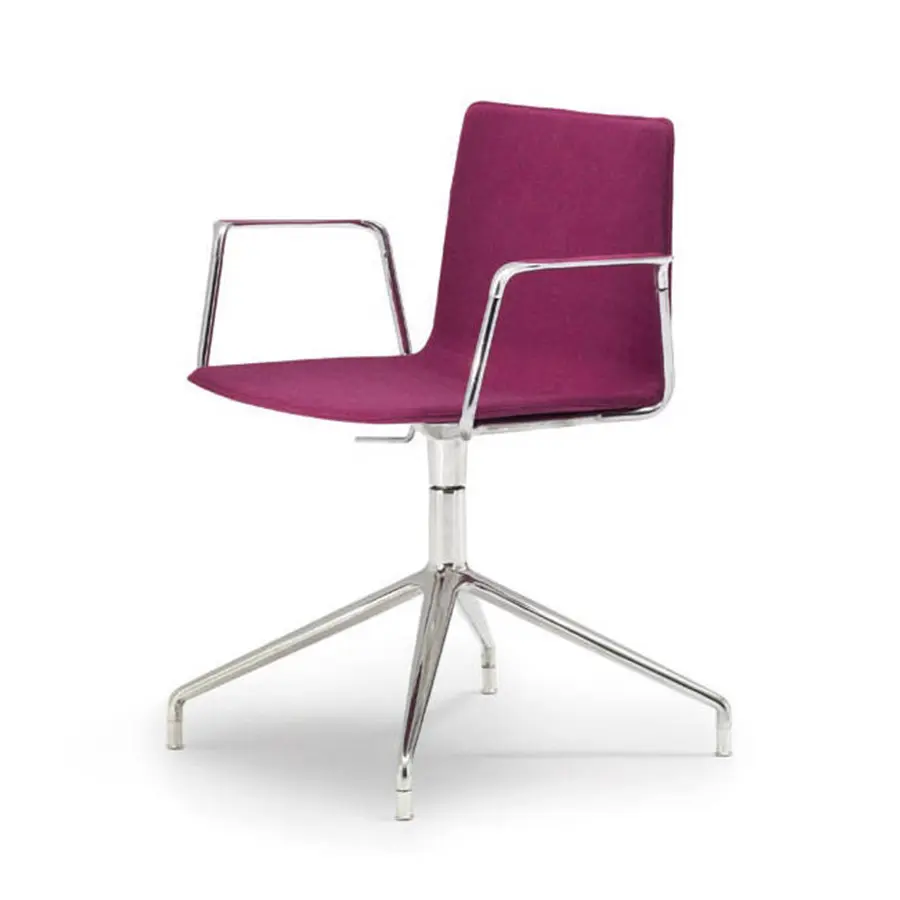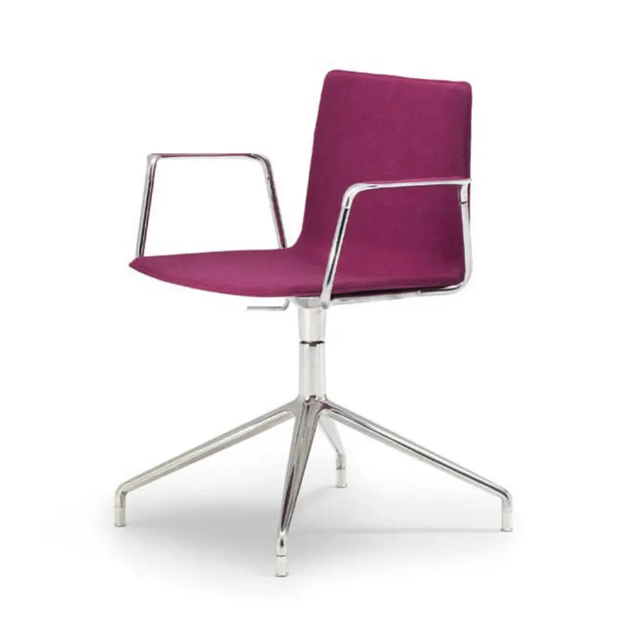 Sillón con carcasa de termopolímero disponible en varios colores y base central giratoria de aluminio de 4 aspas con sistema de retorno y acabado aluminio pulido y otros colores de aluminio. Opción de carcasa tapizada con posibilidad de tapizado con costuras paralelas. Opción de brazos tapizados. Dos opciones de respaldo, una de ellas ligeramente más alta para mejorar la sensación de confort. Opción de sistema basculante. Opción de respaldo en madera de noga.