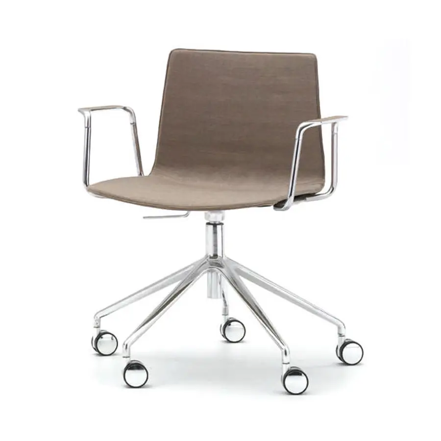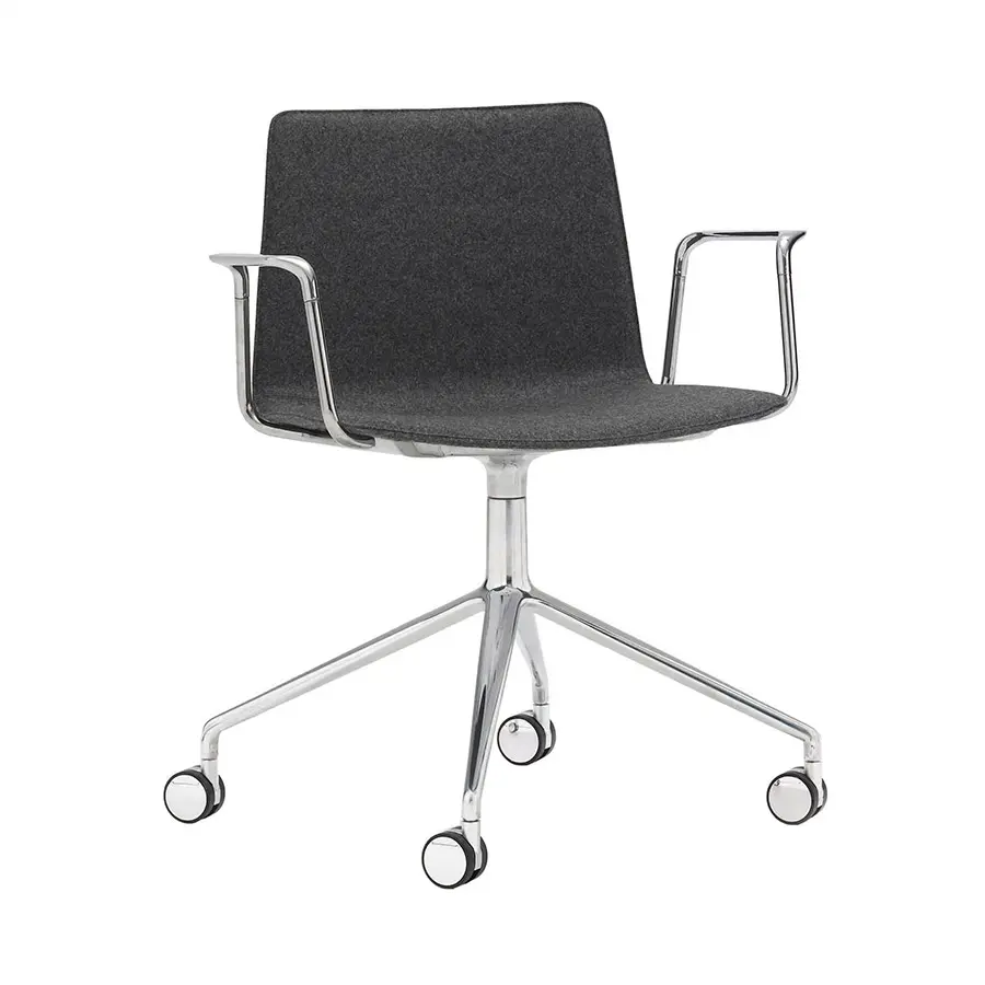 Sillón con carcasa de termopolímero disponible en varios colores y base central giratoria de aluminio con 4 o 5 ruedas, fija o regulable en altura y acabado aluminio pulido. Opción de carcasa tapizada con posibilidad de tapizado con costuras paralelas. Opción de brazos tapizados. Dos opciones de respaldo, una de ellas ligeramente más alta para mejorar la sensación de confort.Opción de brazos tapizados.