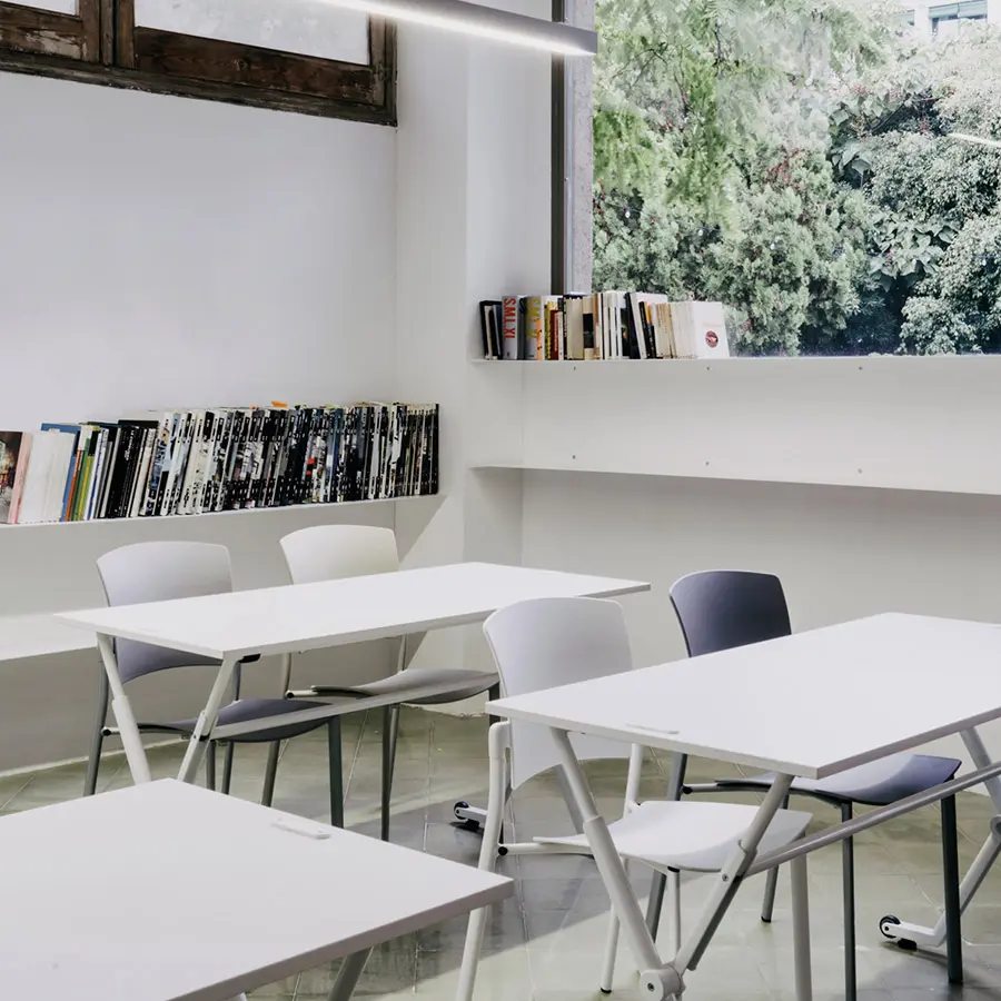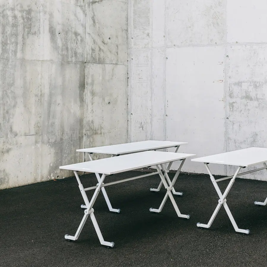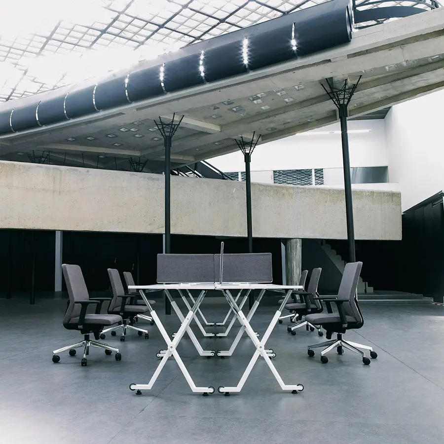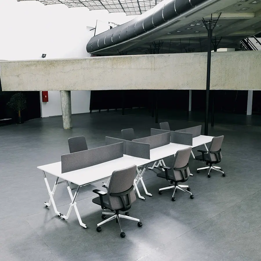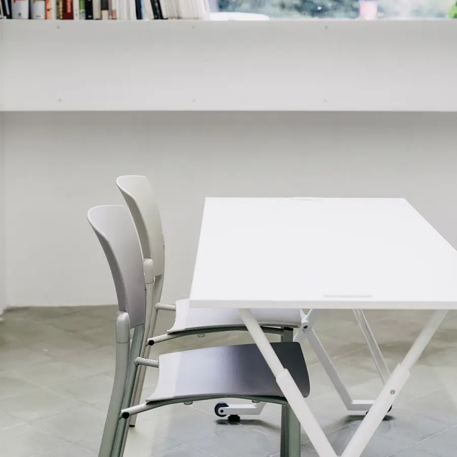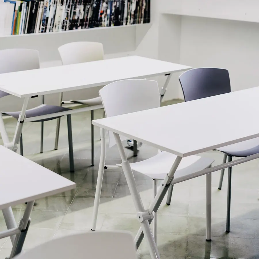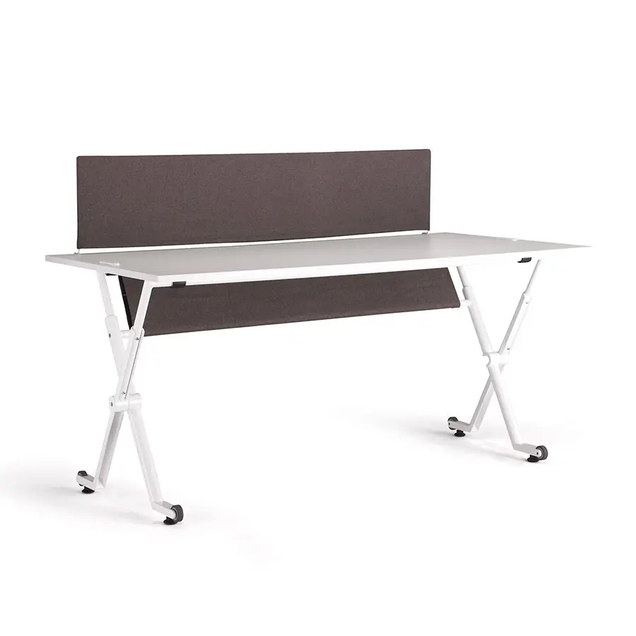 La mesa Folio ha sido diseñada para entornos flexibles y dinámicos, ya que su sistema de plegado y a sus ruedas permiten el apilado y el almacenaje sin renunciar a la estética. Cuenta con una encimera de melamina de diferentes tamaños y con una estructura de metal, además de una gran variedad de accesorios.