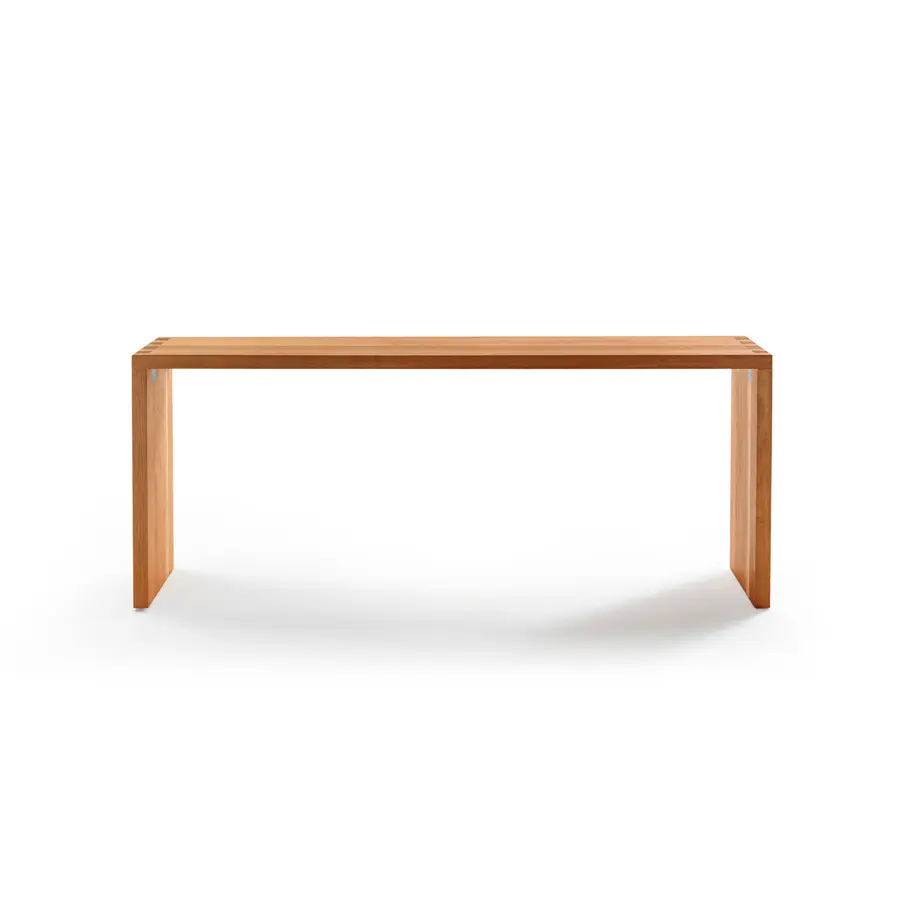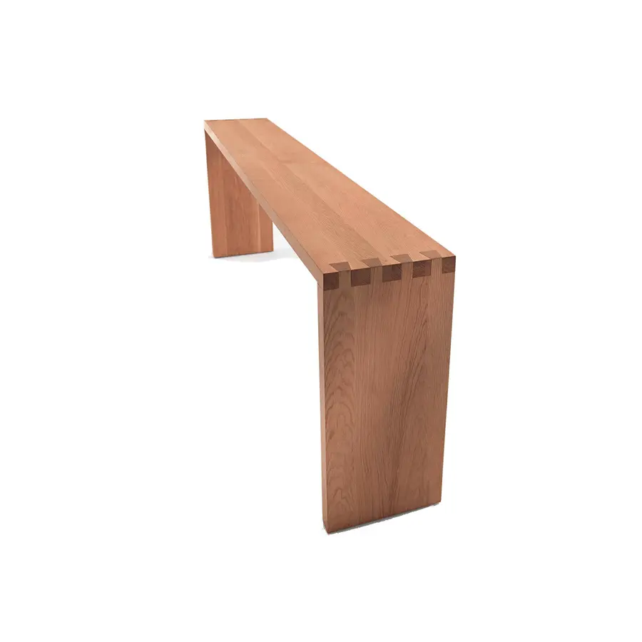 Consola completamente realizada en madera con listones encolados con lados rectos, caracterizada por empalmes de cola de milano entre superficie y base. Acabado: a base de aceite/cera natural de origen vegetal con extractos de pino.