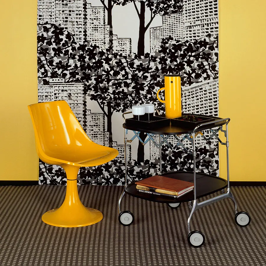 Gastone es un carrito plegable elegante y práctico con superficie superior de plástico barnizado y soporte de acero cromado. Está disponible en cinco tonos: blanco, negro, azul, ciruela y crema. Las ruedas son una característica formal y garantizan la movilidad funcional. Una vez cerrado, tiene una profundidad de 23 cm. Se puede plegar conveniente y fácilmente.