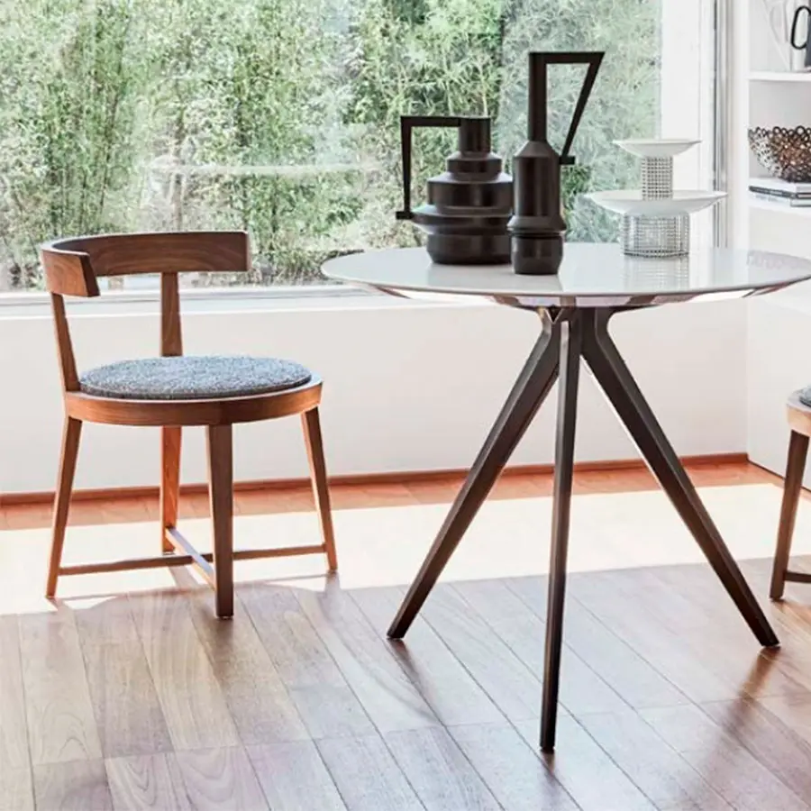 Delicada y suave, la silla Gelsomina presenta unas líneas curvas y femeninas. Su estructura está hecha de madera maciza de nogal americano y de fresno, en una variedad de colores que permiten que la silla Gelsomina sea especialmente versátil. El esencial soporte para el respaldo de madera semicircular gana en comodidad gracias a un mullido cojín de pluma de ganso. Gelsomina tiene una personalidad camaleónica. La pureza del diseño permite elegir la connotación estilística final de la silla según el tipo de madera y del tejido o piel de tapicería que se escoja.