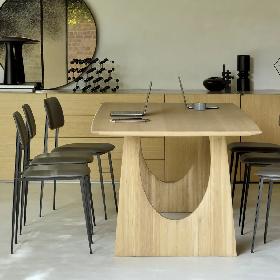 La mesa de comedor Geometric, fabricada en roble macizo, es una pieza concebida para ser protagonista. El lujo viene con su longitud, que se compensa con bordes suavizados y líneas naturales. Interesantes formas están presentes para dar volúmen y confort. Ideal como mesa de comedor o de trabajo.