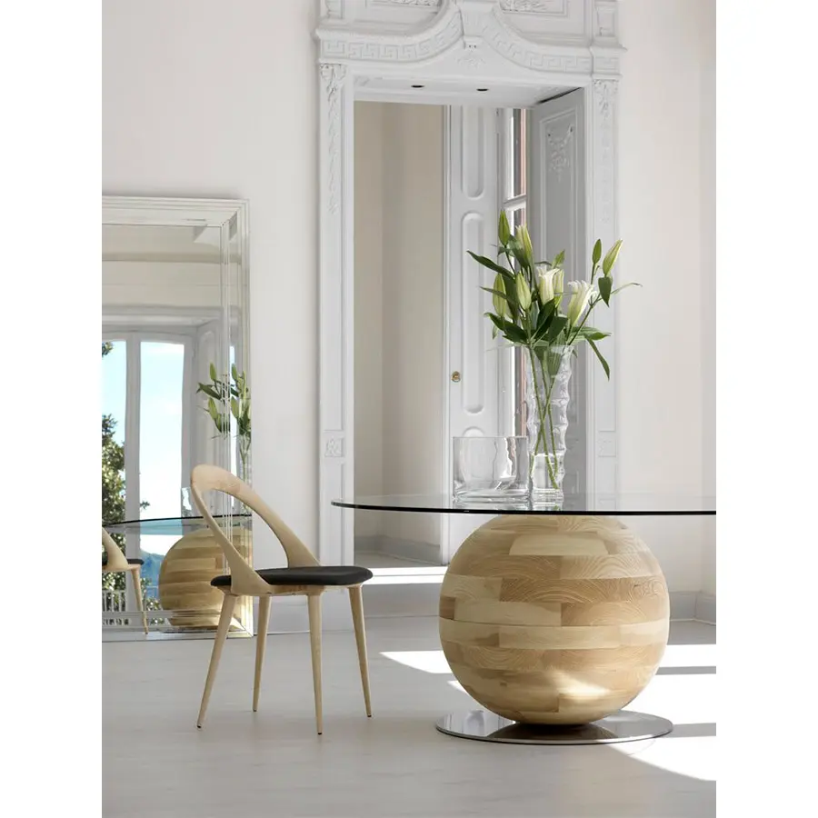 Mesa de comedor con base de nogal canaletta o fresno macizo montada sobre de un disco de metal y tapa de cristal templado (espesor mm. 12).