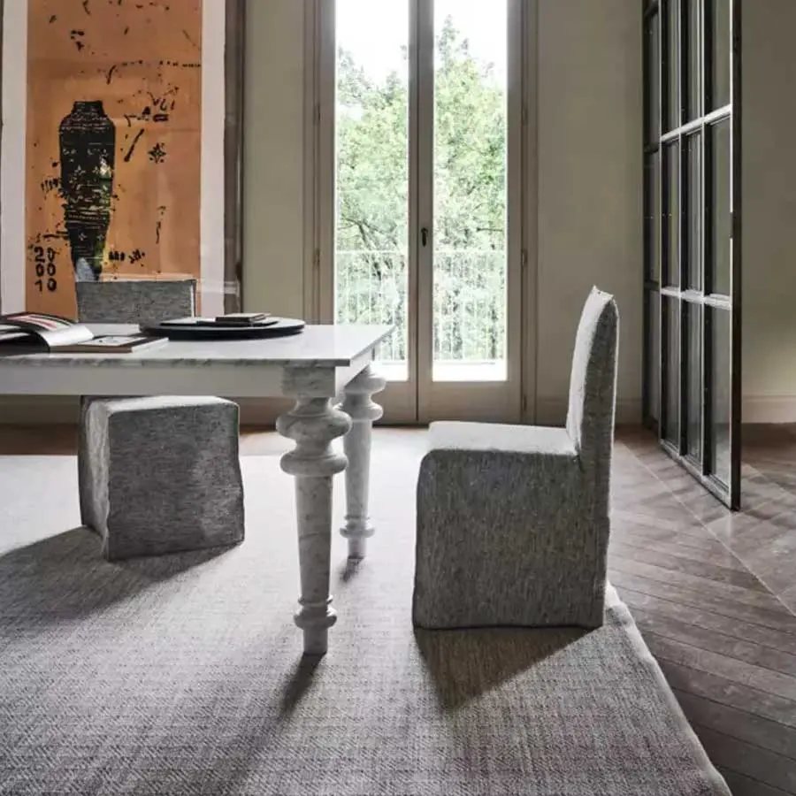 Sillas con y sin brazos que tienen una estructura minimalista, con formas geométricas limpias y definidas. La familia de sillas Ghost tiene una estructura de madera que se combina con revestimientos de poliuretano expandido. La característica principal de las sillas Ghost es la funda extraíble, una funda de gran tamaño cuyo perfil está destacado por las costuras a la vista, que permite desvestir y volver a vestir a los productos en un instante. Se trata de un diseño textil que cambia fácilmente el aspecto, permitiendo pasar de un look formal a uno informal con facilidad y rápidamente.