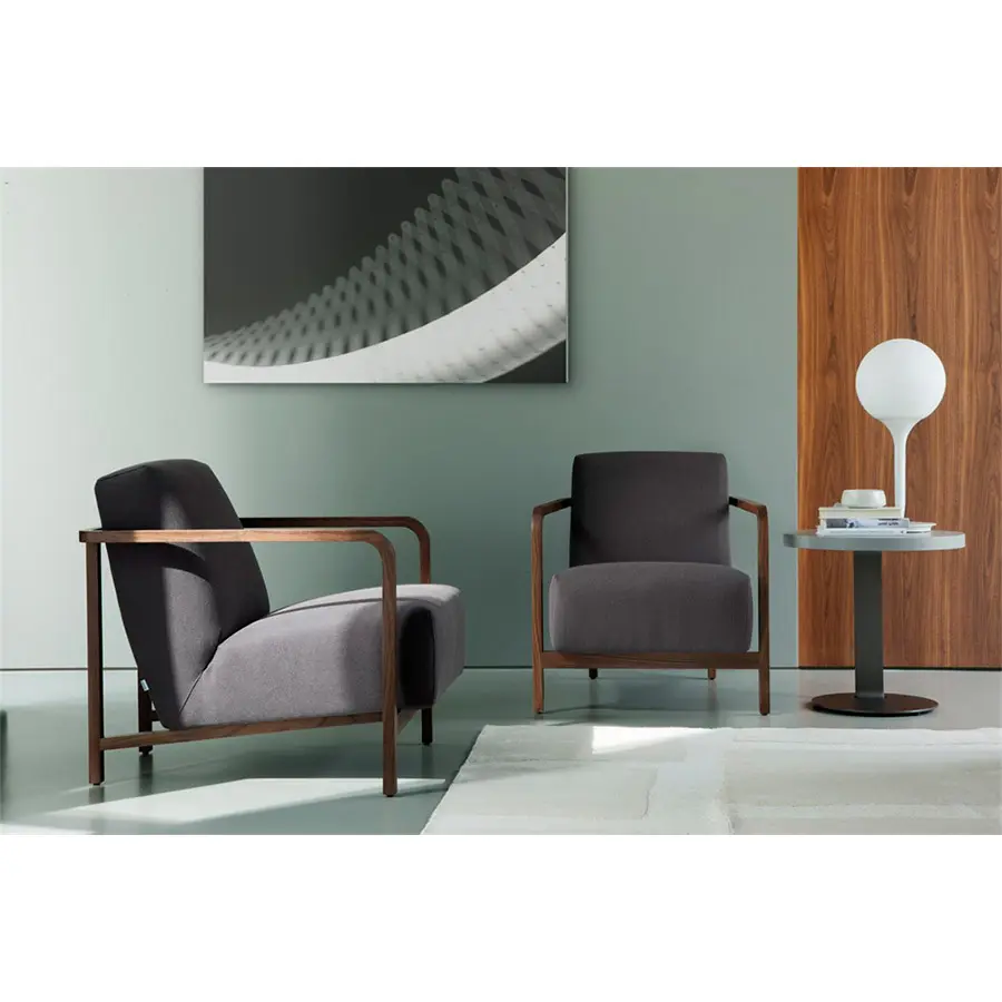 Butaca con estructura de nogal canaletta macizo y revestimiento desenfundable en las telas de la colección. Dimensiones 65x82x73 – Gilda es una butaca de carácter atemporal, gracias a sus diensiones, es perfecta para cerrar una estancia de estar o bien un dormitorio.