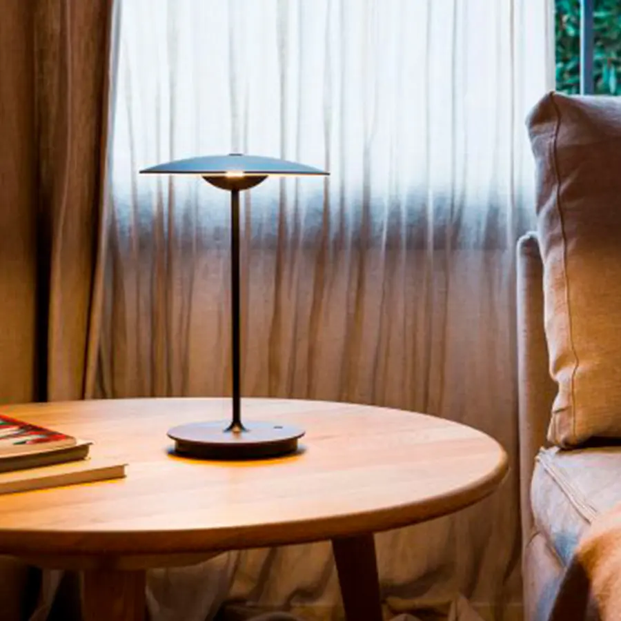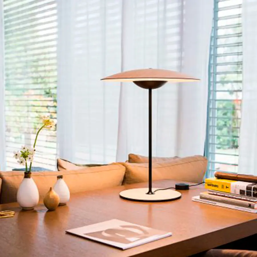 Difusor y base de madera prensada de 4 mm en roble natural o wengué. Disipador de aluminio inyectado y tija metálica lacados en negro mate.