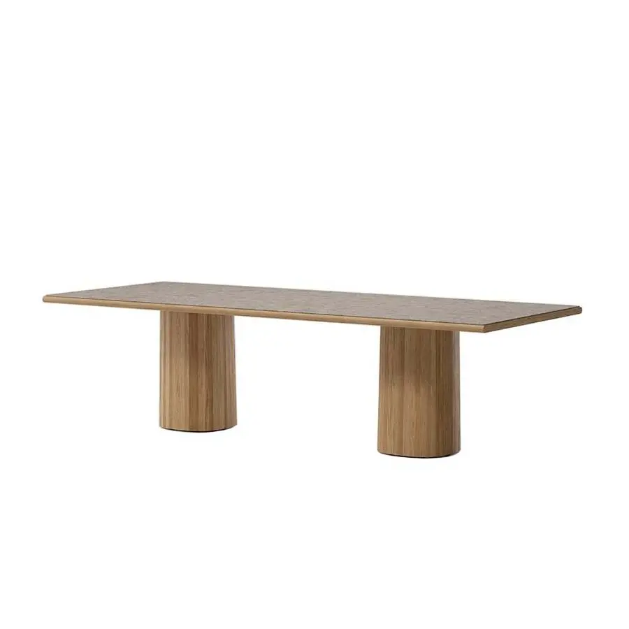 Presenta dos bases centrales y estructura en madera de Teca que contrasta con el sobre cerámico disponible en varios colores neutros que la hacen perfecta para crear ambientes elegantes y sofisticados de exterior e interior.