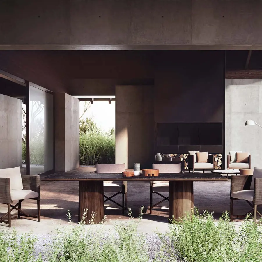 Presenta dos bases centrales y estructura en madera de Teca que contrasta con el sobre cerámico disponible en varios colores neutros que la hacen perfecta para crear ambientes elegantes y sofisticados de exterior e interior.