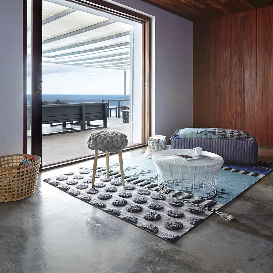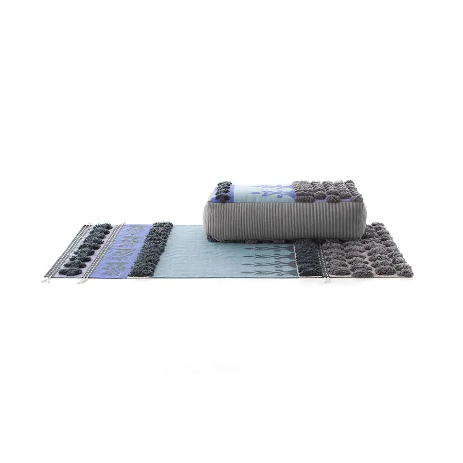 Esta es la alfombra Tumbuctú de la colección Glaoui, una pieza disponible en dos tamaños elaborada con un complejo sistema artesanal que alterna tres tipos de técnicas. Las diferentes texturas y volúmenes de sus motivos se confeccionan con pelo anudado, tejido plano y bordado, un laborioso método de origen marroquí del que la colección toma su nombre. La colección Glaoui está integrada por una serie de alfombras y pufs que mezclan de manera ecléctica y armónica un variado estilo de patrones de dibujo y texturas. Una compleja técnica tradicional de Marruecos llevada a otra dimensión estética por la diseñadora Sandra Figuerola, quien se ha inspirado en colores, gráficas y topografías de origen africano e indio para sus motivos.